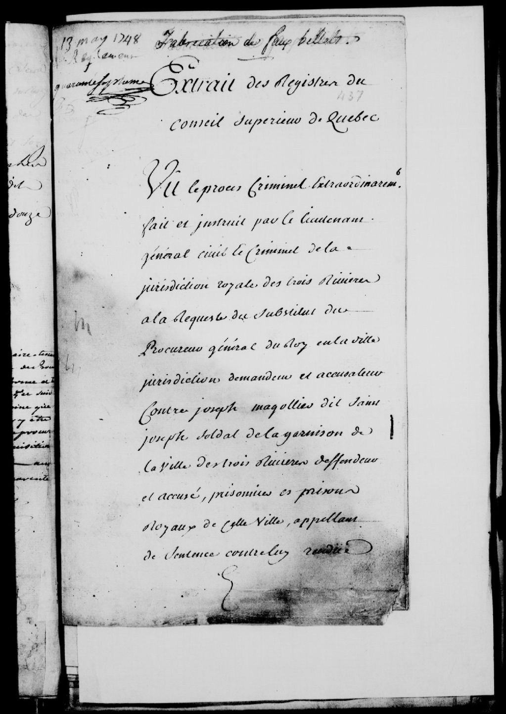 Arrêt du Conseil supérieur de Québec au procès de Joseph Magollier dit Saint-Joseph, prisonnier, soldat de la garnison de Trois-Rivières, appelant de la sentence rendue le 13 avril dernier par la Juridiction royale de ladite ville, accusé d'avoir fabriqué des faux-billets signé Rigaud, sieur de Vaudreuil, et de s'être frauduleusement servi du nom et d'une fausse permission de monsieur Roland-Michel Barrin, marquis de La Galissonière, commandant général en Nouvelle-France, et d'avoir changé de nom afin de mieux tromper les habitants