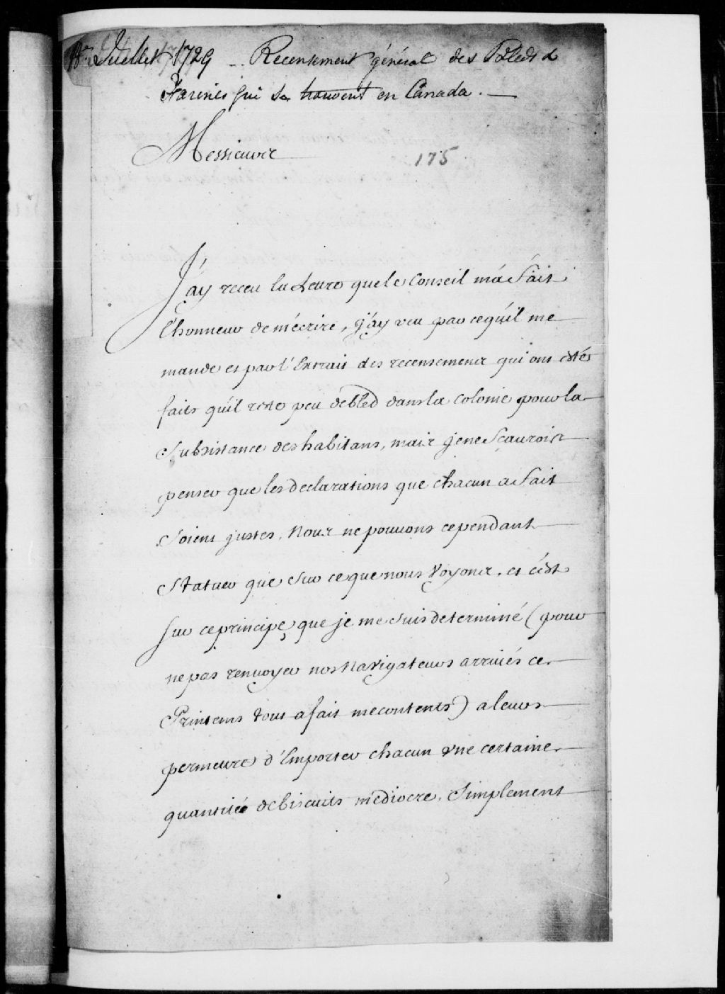 - Recensement général du blé, de la farine et des biscuits qui se trouvent dans les gouvernements de Québec, de Trois-Rivières et de Montréal en conformité avec l'arrêt du 21 mai 1729 rendu par le Conseil supérieur de Québec