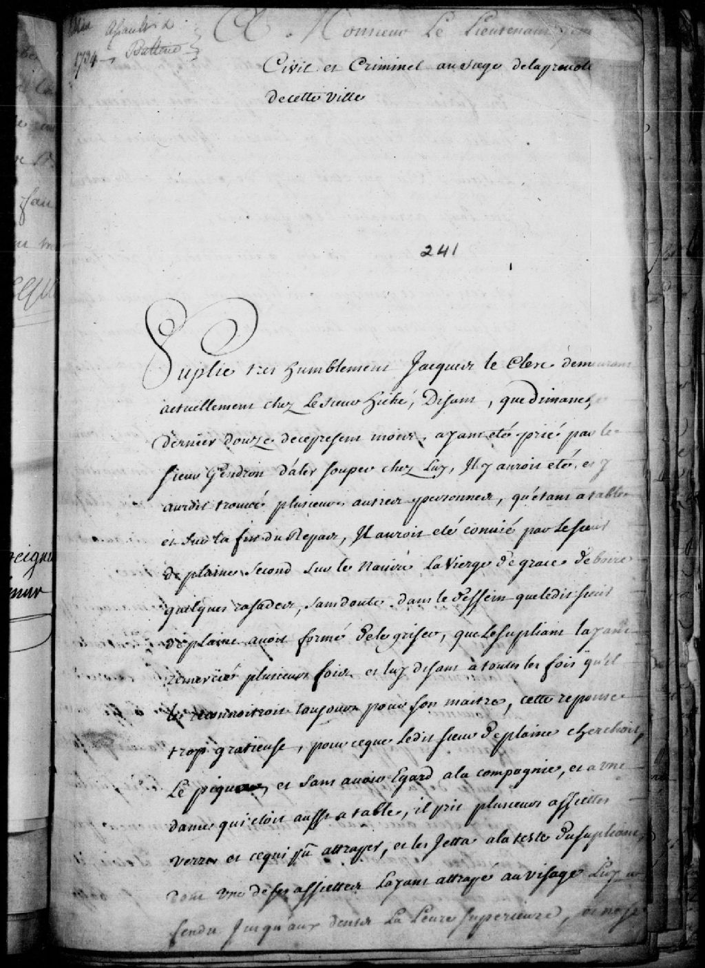 Requête de Jacques Leclerc, demeurant chez le sieur Hiché, adressée au lieutenant général de la Prévôté de Québec, pour porter plainte contre le sieur Deplaine, second sur le navire «la Vierge de Grâce», pour insultes, coups et blessures