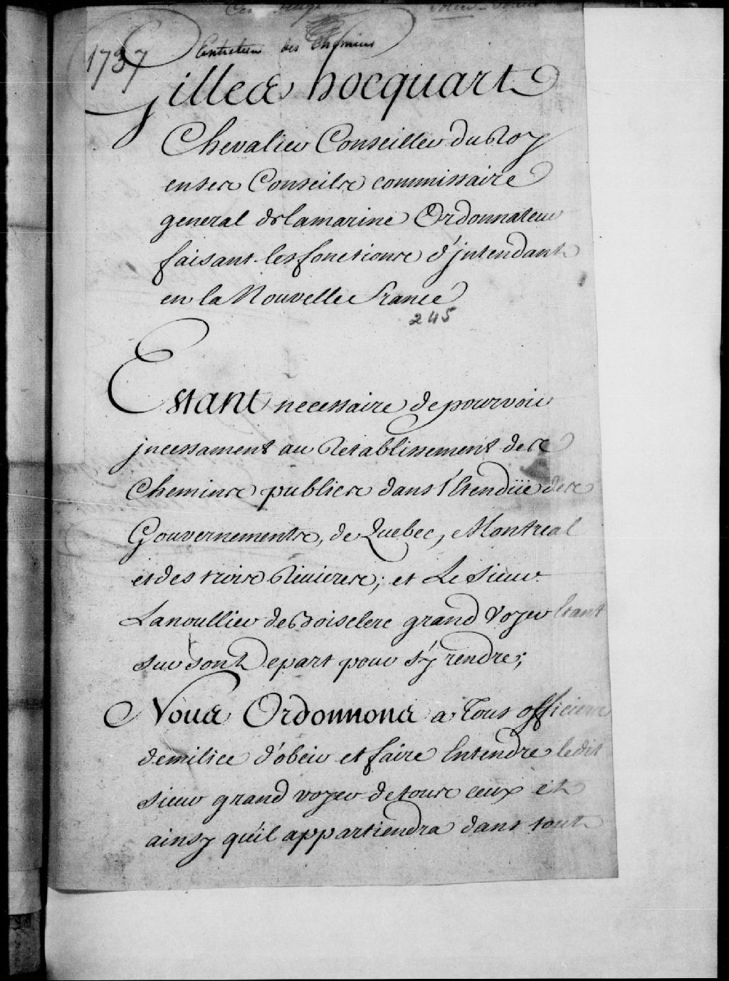 Ordonnance de Gilles Hocquart, intendant, aux officiers de milice leur ordonnant d'obéir à Lanouiller (Lanoullier), sieur de Boisclerc, grand voyer, chargé de rétablir les chemins publics dans les gouvernements de Québec, de Trois-Rivières et de Montréal, 11 janvier 1737, Archives nationales à Québec, Fonds Conseil souverain, (03Q,TP1,S777,D27).