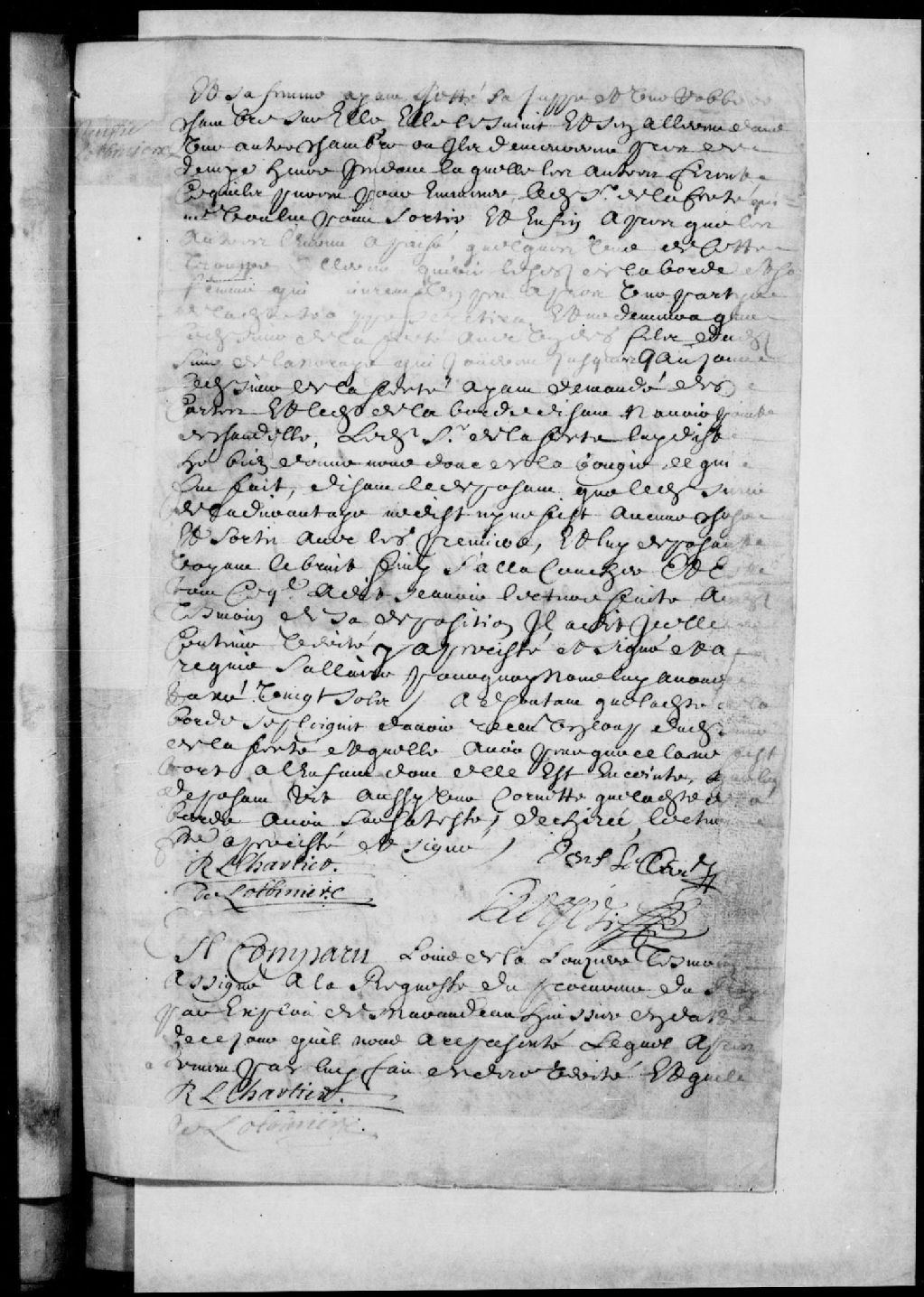 - Procès instruit par la Prévôté de Québec concernant Jean-Baptiste Lemoyne (Lemoine), sieur de Martigny, Joseph Guyon (Guion) de Rouvray, Jean Lemaître, Joseph Guyon, Louis et Pierre de Niort, frères et fils de Louis, sieur de LaNoraye, jeunes gens accusés de vandalisme nocturne