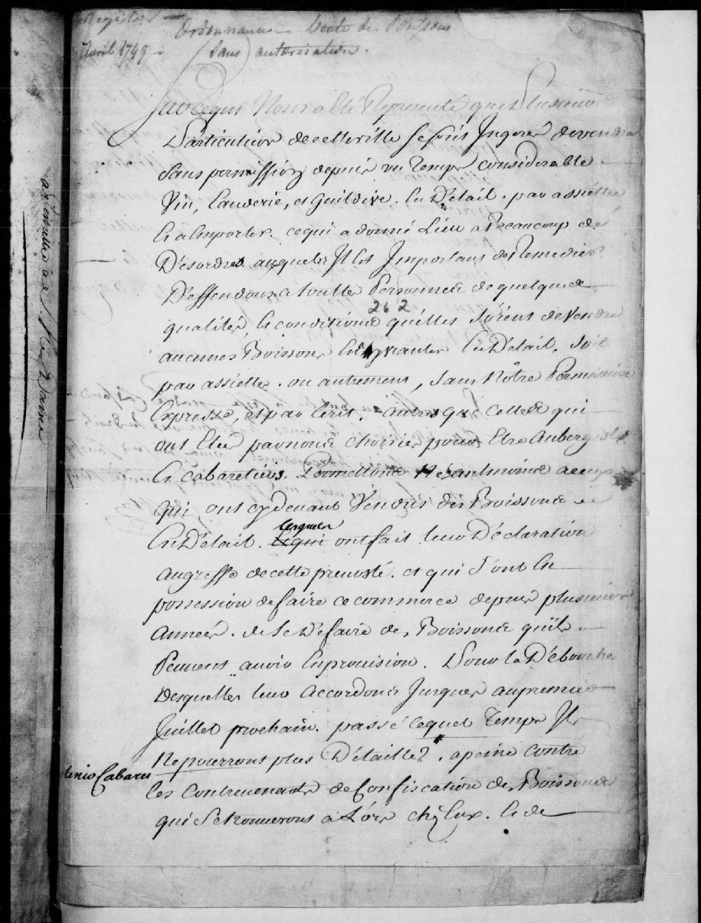 Ordonnance de François Daine, lieutenant général de la Prévôté de Québec, défendant à toutes personnes, n'ayant pas de permission, de vendre des boissons (alcool), publiée le 2 mai 1749, 30 avril 1749, Archives nationales à Québec, Fonds Conseil souverain, (03Q,TP1,S777,D35).