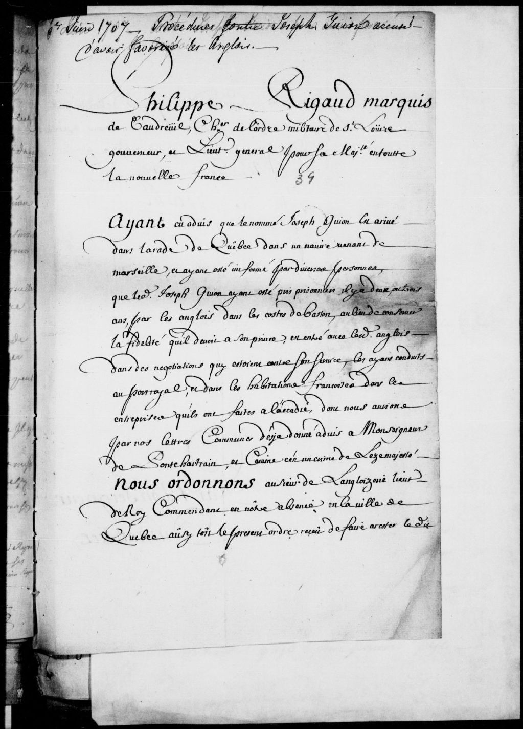 Mandement donné par Philippe Rigaud, sieur de Vaudreuil, gouverneur de la Nouvelle-France, afin d'arrêter Joseph Guyon (Guion), arrivé avec un navire de Marseille, en rade de Québec, accusé d'intelligence avec les Anglais, 6 juin 1707, Archives nationales à Québec, Fonds Conseil souverain, (03Q,TP1,S777,D4).