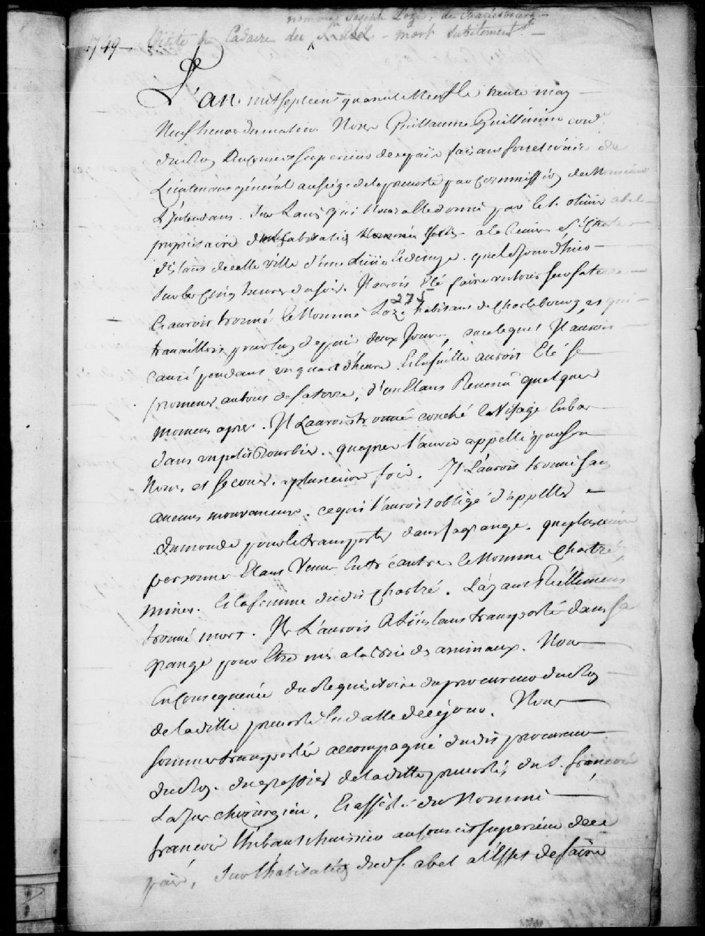 - Procès-verbal de Guillaume Guillimin (Guillemin), conseiller du Roi au Conseil supérieur de Québec, faisant fonction de lieutenant général de la Prévôté de Québec, qui s'est rendu à la rivière Saint-Charles constater le décès de Joseph Lauzé, habitant de Charlesbourg, certificat médical de François Lajus, chirurgien, constatant que la cause du décès est une mort naturelle