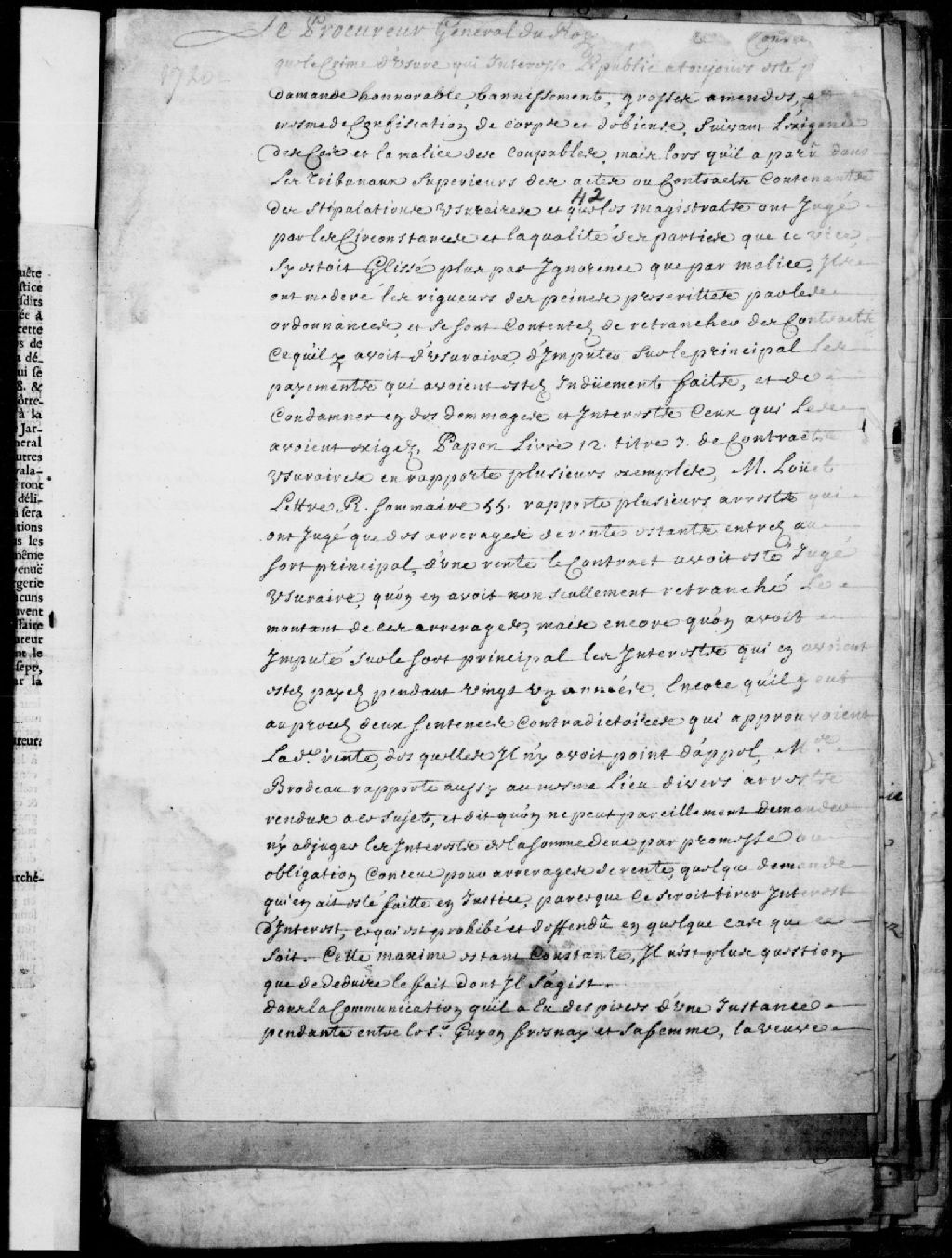 Réquisitoire de Collet, procureur général du Roi, requérant que le sieur Guyon (Guion) dit Fresnay soit condamné pour usure au préjudice de sa belle-mère, feue Jacquette Lefranc et proposant que pour cela il doive rembourser l'argent indûment reçu, pour moitié au tuteur des enfants de feu Nicolas Volant, les petits-enfants de la victime, et l'autre moitié à Marguerite Niel, veuve Coutard, fille de la victime, 27 avril 1720, Archives nationales à Québec, Fonds Conseil souverain, (03Q,TP1,S777,D54).