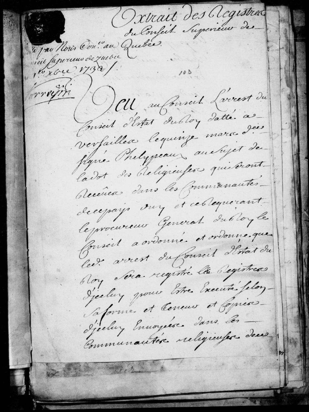 - Arrêt du Conseil d'état du Roi qui ordonne qu'à l'avenir la dot des filles voulant faire profession dans les communautés religieuses de la Nouvelle-France sera de 3 000 livres alors que le précédent arrêt du 31 mai 1722 la fixait à 5 000 livres