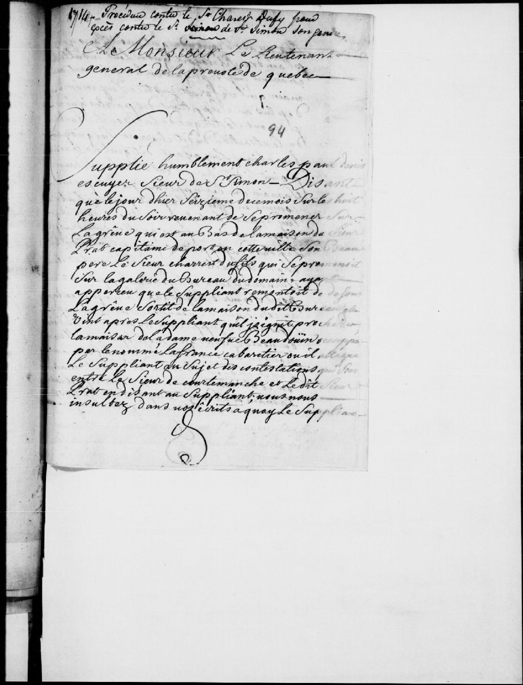 - Ce dossier en matières criminelles comprend la requête du demandeur au lieutenant particulier de la Prévôté de Québec ainsi que l'ordonnance du lieutenant particulier pour faire assigner les témoins. Les pièces proviennent de la Prévôté de Québec. Ce dossier contient les interrogatoires ou les dépositions des personnes suivantes : Charles Ruette, sieur de Monceaux, écuyer, de présent à Québec; Louis Paris fils, cordonnier; Marge Lefebvre (Lefèvre), servante, demeurant chez monsieur Fournel, marchand