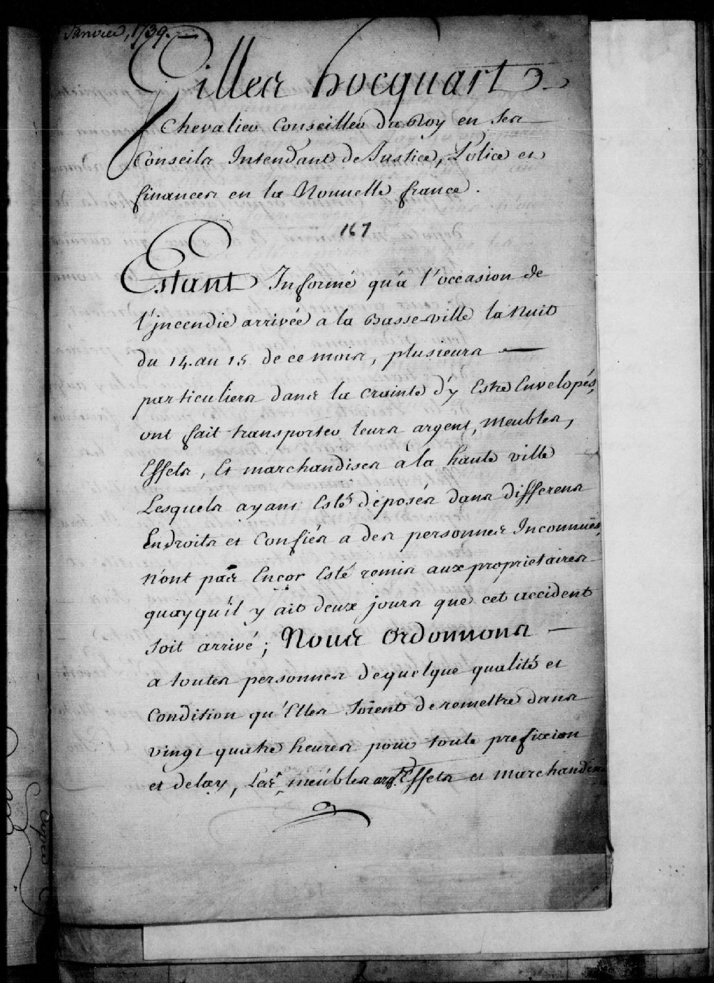 Ordonnance de Gilles Hocquart, intendant, enjoignant à toutes les personnes qui ont chez elles des meubles, de l'argent et des marchandises de les rendre à leurs propriétaires dans les vingt-quatre heures, ceux-ci les ayant mis en dépôt dans la Haute-Ville de Québec afin de les sauver de l'incendie de la Basse-Ville dans la nuit du 14 au 15 dudit mois et le même ordre est donné à ceux ayant chez eux des instruments et des outils de lutte contre le feu afin qu'ils les ramènent aux magasins du Roi, 17 janvier 1739, Archives nationales à Québec, Fonds Conseil souverain, (03Q,TP1,S777,D73).
