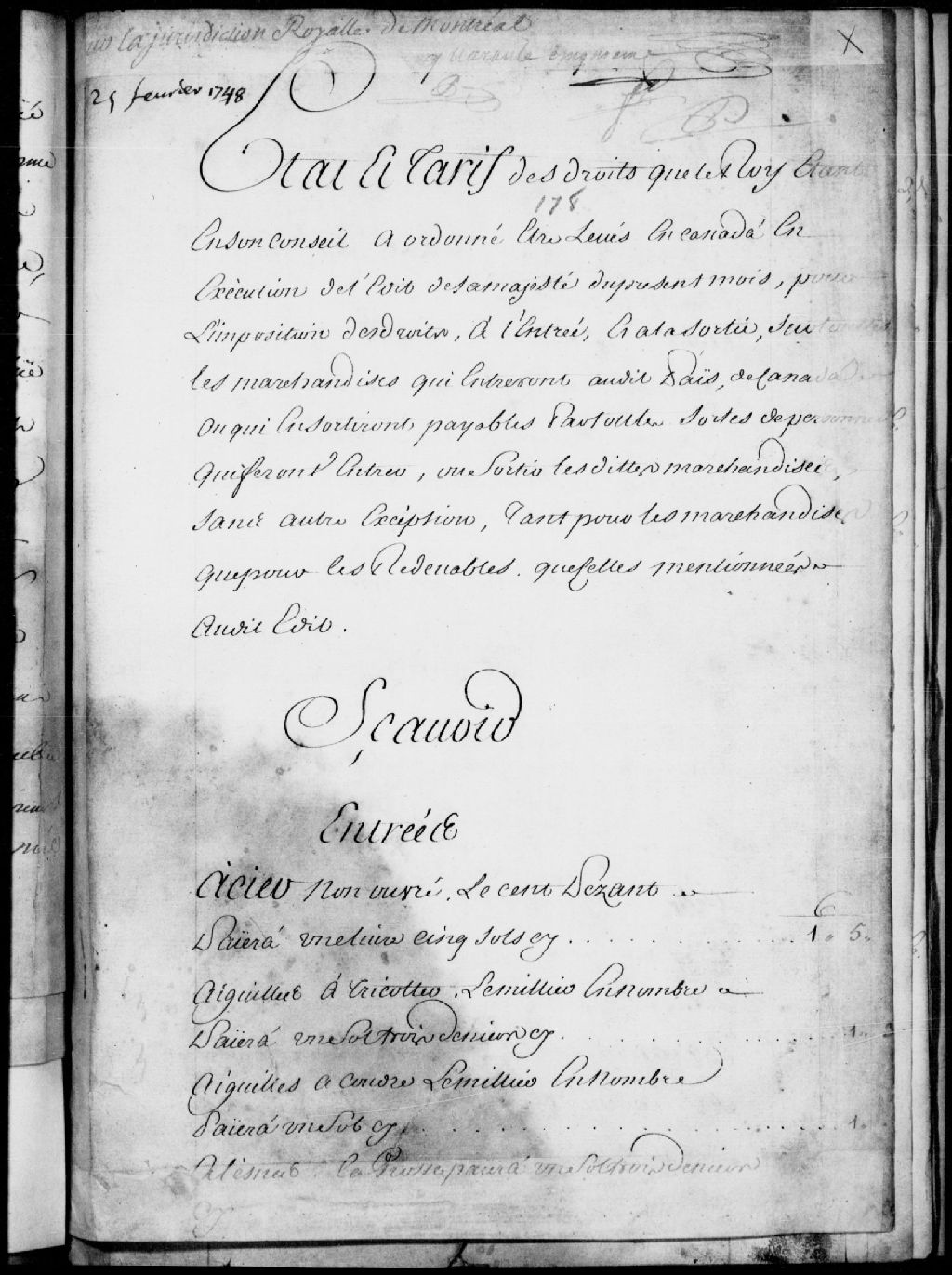 - Édit du Roi ordonnant, pour faire face aux dépenses occasionnées par la défense de la colonie telle que les fortifications de Québec, l'imposition de droits à l'entrée et à la sortie des marchandises exemptées par l'arrêt du 23 janvier 1747, selon l'état et tarif desdits droits, état et tarif des droits, arrêt du Conseil d'état du Roi permettant un sursis à l'exécution de l'édit de février 1748, qui s'appliquera lorsque la paix sera revenue dans la colonie, arrêts du Conseil supérieur de Québec visant à faire enregistrer l'édit du Roi ainsi que l'état et tarif des droits et l'arrêt du Conseil d'état du Roi