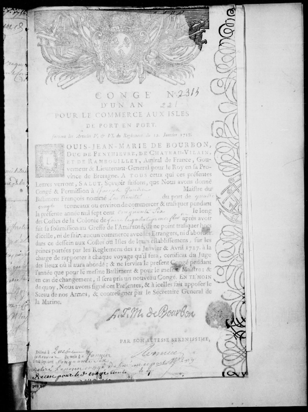 Congé d'un an pour le commerce aux îles de port en port octroyé à Joseph Gaudin, maître du bâtiment français «la Trinité» pour faire du cabotage en ce fleuve Saint-Laurent