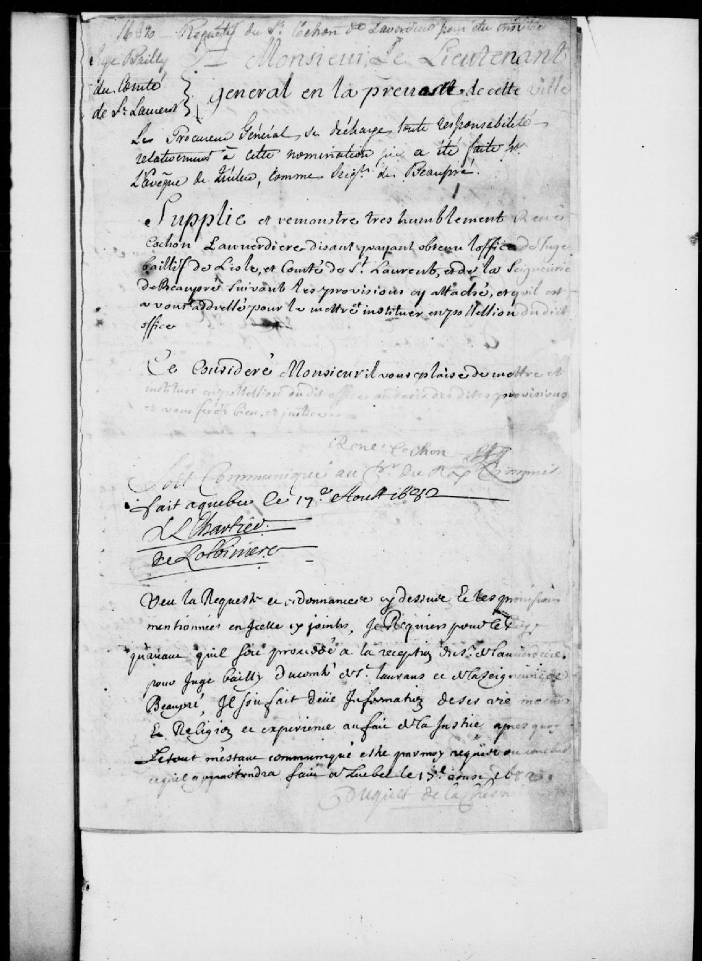 - Information de vie et de moeurs de René Cauchon, sieur de Laverdière (Lauverdière) pour être institué juge bailli de l'île et comté de Saint-Laurent et de la seigneurie de Beaupré, suite aux lettres de provision obtenues le 17 août de l'évêque de Québec, seigneur de Beaupré