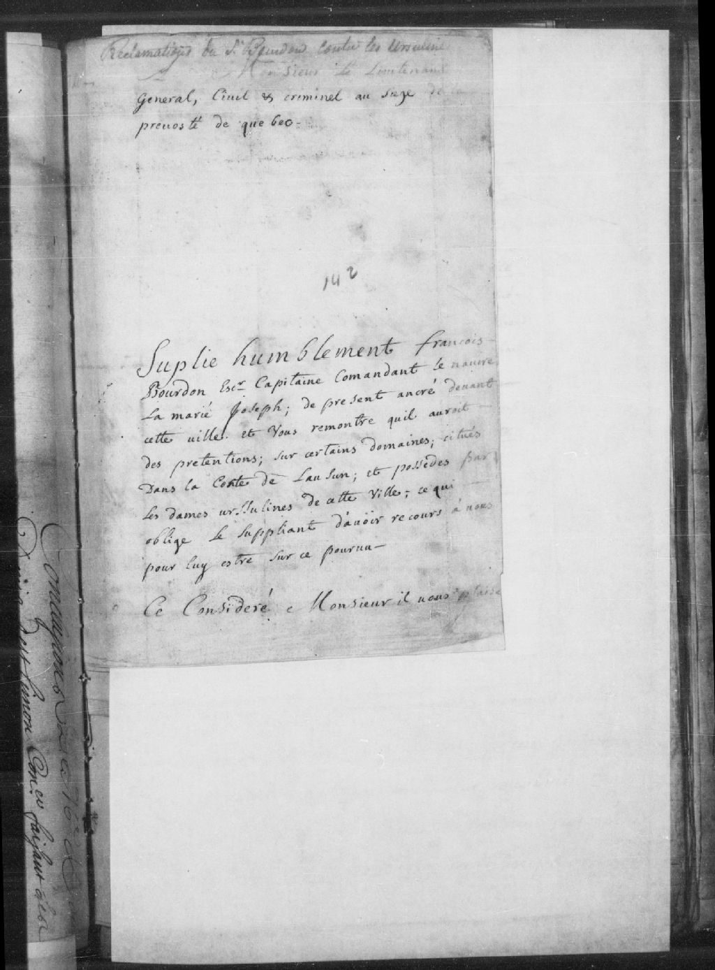 - Procès entre François Bourdon, sieur de la Pinaudière, écuyer, capitaine commandant le navire «la Marie-Joseph», représentant le feu Jean-François son père, sieur de Dombourg, écuyer et de feu Jean son aïeul, sieur de Saint-Jean, procureur général du Roi au Conseil souverain, demandeur, et les religieuses Ursulines de Québec, défenderesses, concernant certains domaines situés dans la côte de Lauzon et possédés par les religieuses