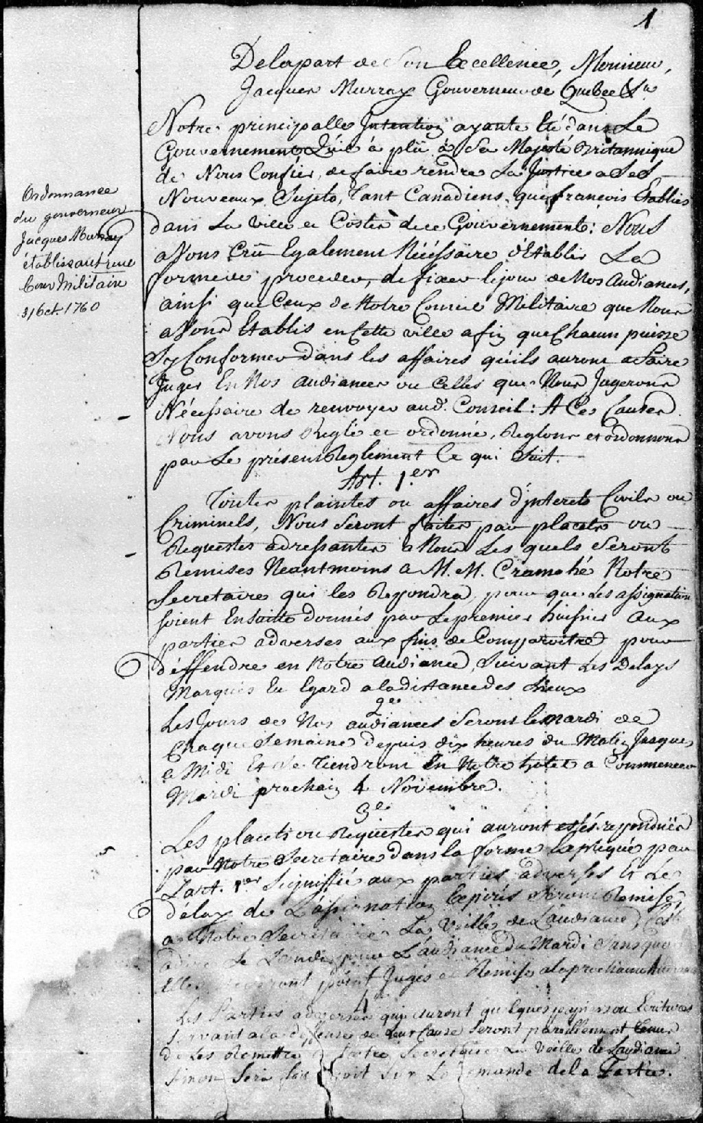 Ordonnance du gouverneur Jacques (James) Murray établissant une Cour militaire à Québec, 31 octobre 1760, Archives nationales à Québec, Fonds Conseil militaire de Québec, (03Q,TL9,P1000).