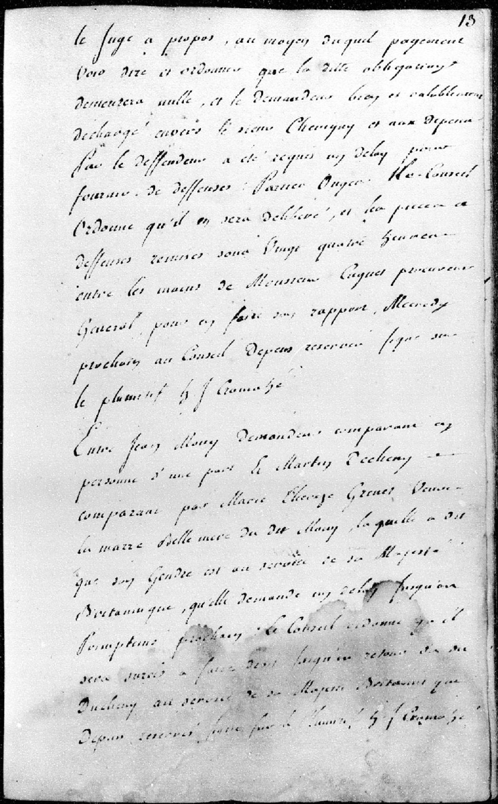 Jean Mony (Mosny), demandeur, contre Martin Decheny, représenté par sa belle-mère Marie-Thérèse Grenet qui demande un délai jusqu'au printemps afin que son gendre puisse comparaître en personne, étant absent pour son travail au service de Sa Majesté britannique