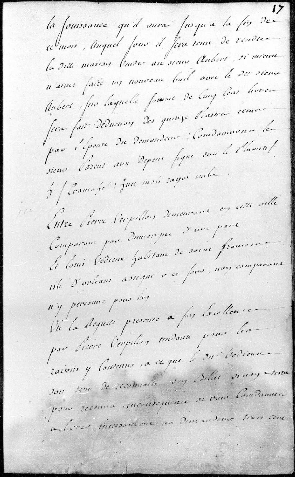 Requête présentée par Pierre Verpillon, représenté par l'huissier Dumergue, contre Louis Vedieux (Vérieul). Le demandeur souhaite que ledit Vedieux soit tenu de respecter son billet et lui livre sa farine, son blé et son lard, 12 novembre 1760, Archives nationales à Québec, Fonds Conseil militaire de Québec, (03Q,TL9,P1020).
