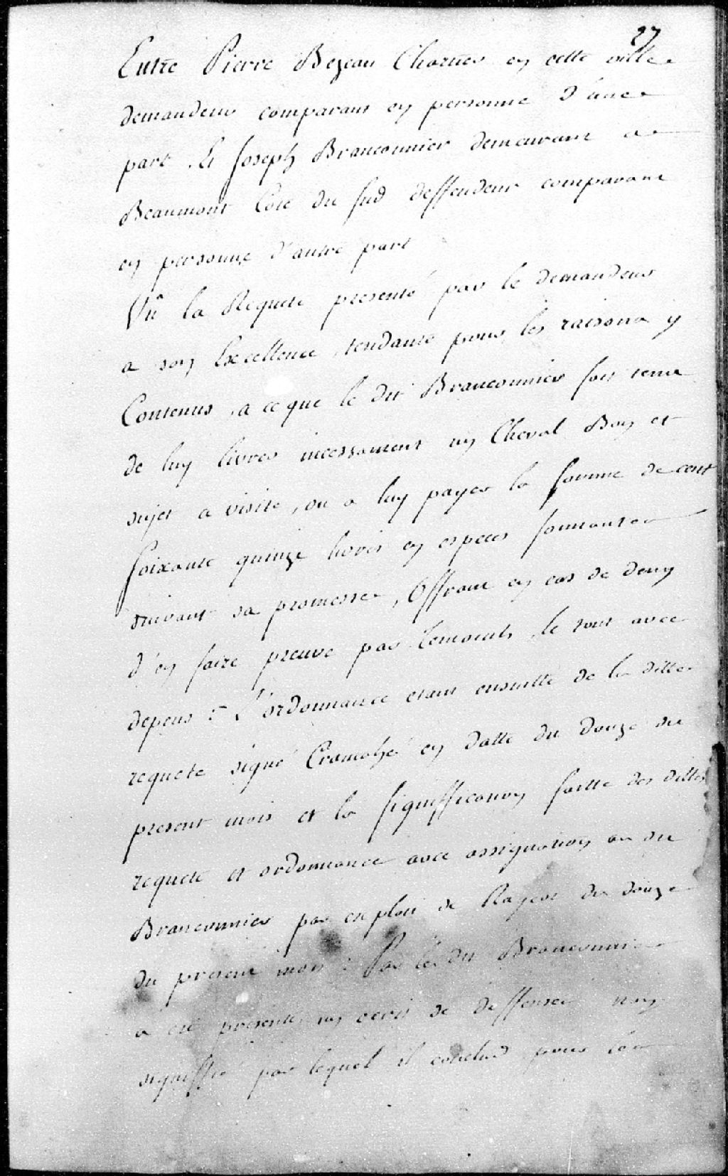Entre Pierre Bezeau, demandeur, contre Joseph Braconnier (Branconnier), défendeur. Requête visant à ce que le défendeur lui livre un bon cheval ou qu'il lui rende son argent. Le Conseil condamne ledit Braconnier à rendre au demandeur un cheval tel qu'il en était convenu avec lui ou à lui payer 175 livres en espèces, 22 novembre 1760, Archives nationales à Québec, Fonds Conseil militaire de Québec, (03Q,TL9,P1033).