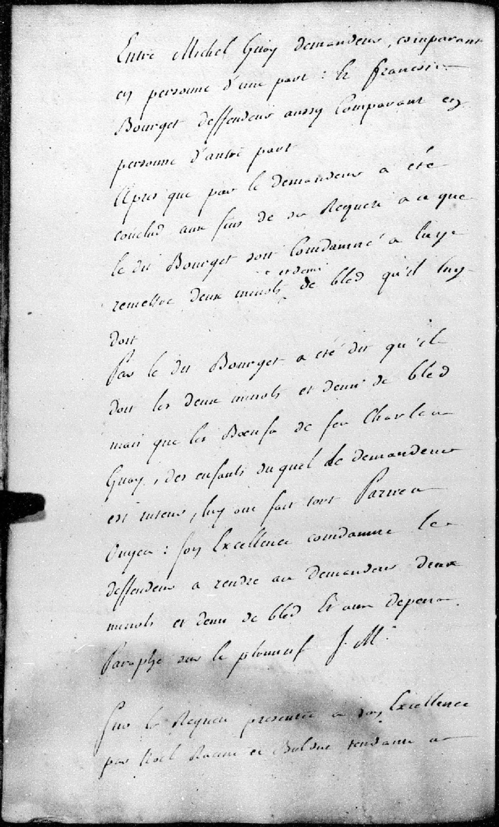 Sur la requête présentée à Son Excellence par Noël Racine et Bolduc, afin d'être payés pour les différentes fournitures, en farine et en boeuf, pour le service de Sa Majesté. Son Excellence ordonne que les requérants feront serment au Conseil comme quoi ils n'ont point été payés pour leurs fournitures, ni du manutentionnaire du Roi ni de qui que ce soit