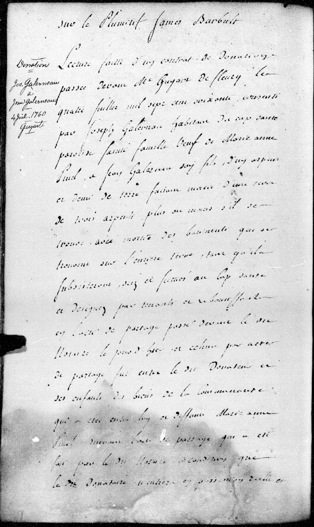 Lecture d'un contrat de donation passé devant maître Guyart De Fleury, notaire, consenti par Joseph Galarneau, habitant du Cap-Santé, paroisse Sainte-Famille, veuf de Marie-Anne Pinel, au profit de Jean Galarneau, son fils. Le Conseil ordonne que le présent contrat sera et demeurera insinué et registré au greffe de la Cour et du Conseil militaire de Québec, 24 janvier 1761, Archives nationales à Québec, Fonds Conseil militaire de Québec, (03Q,TL9,P1109).
