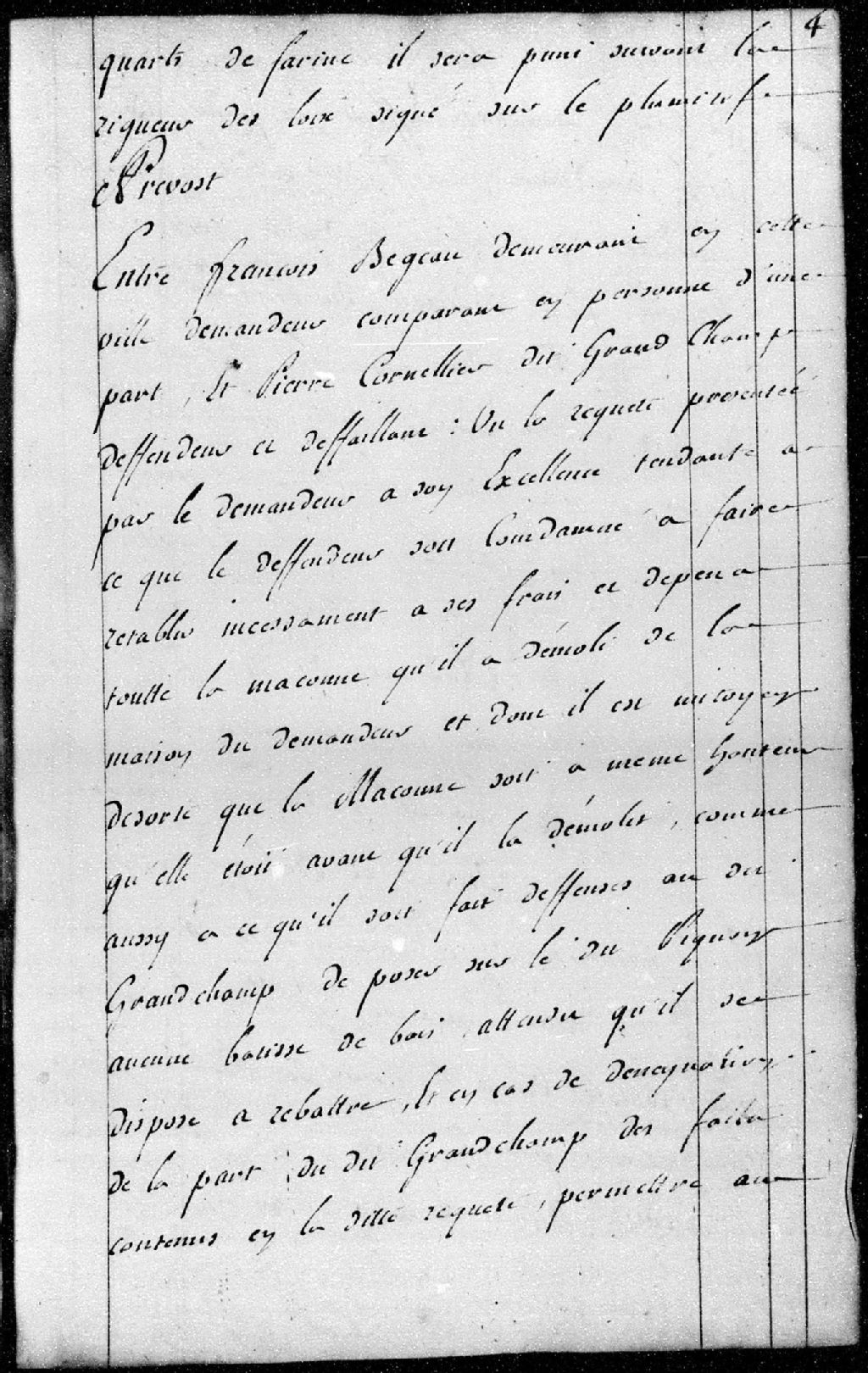 Entre François Begeau, demeurant en cette ville (Québec), demandeur, et Pierre Cornellier (Cornelier), défendeur. Requête présentée afin que le défendeur soit condamné à rétablir, à ses frais, la maçonne qu'il a démolie de la maison du demandeur, 13 juin 1761, Archives nationales à Québec, Fonds Conseil militaire de Québec, (03Q,TL9,P2004).