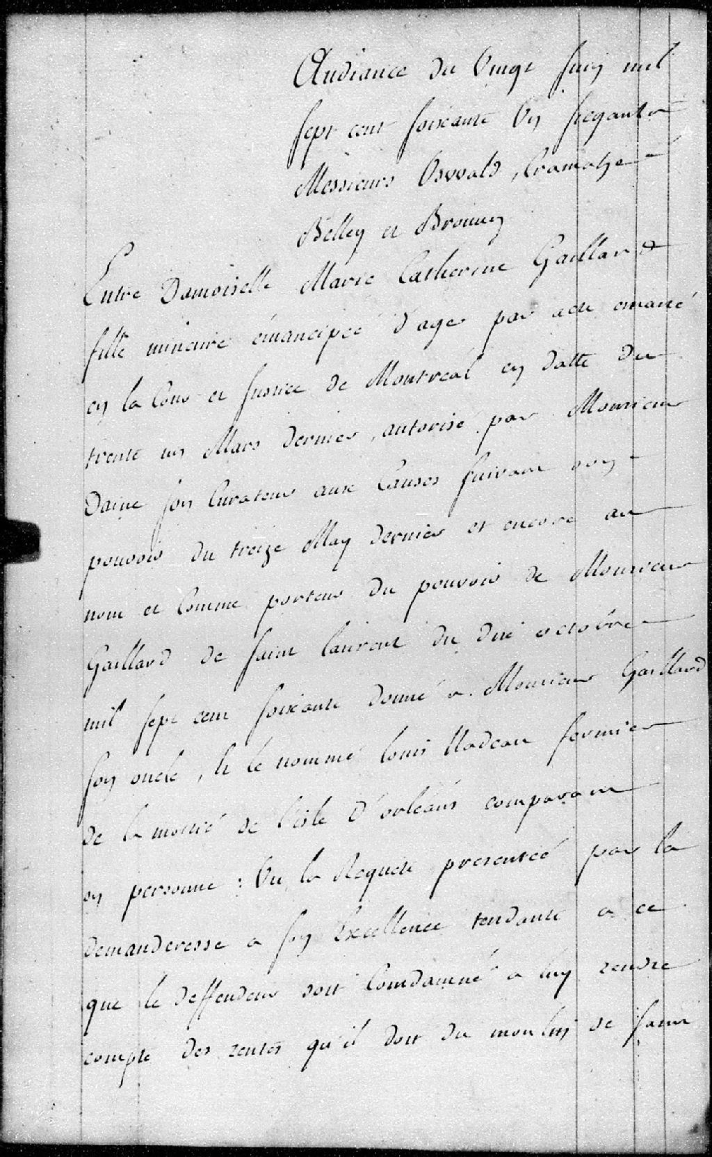 Entre demoiselle Marie-Catherine Gaillard, demanderesse, et Louis Nadeau, fermier, défendeur. Requête présentée afin que le défendeur soit condamné à lui rendre compte des rentes qu'il doit des moulins de Saint-Jean et de la Sainte-Famille, 20 juin 1761, Archives nationales à Québec, Fonds Conseil militaire de Québec, (03Q,TL9,P2014).