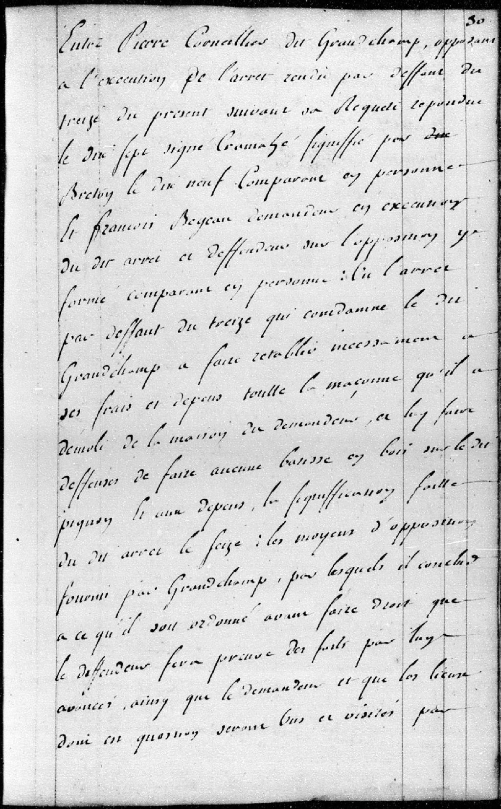 Entre Pierre Cornellier (Cornelier) dit Grand Champs (Grandchamp), demandeur, et François Begeau, défendeur. Le Conseil ordonne que par le sieur La Palme (Lapalme), architecte, sera effectuée une visite du mur en question, 24 juin 1761, Archives nationales à Québec, Fonds Conseil militaire de Québec, (03Q,TL9,P2039).