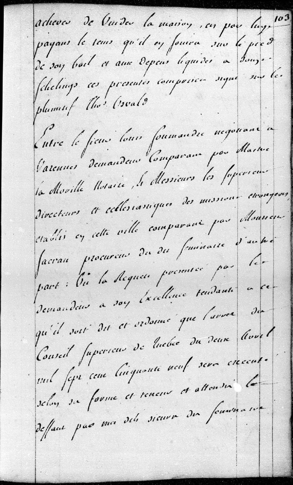 Entre le sieur Louis Soumandre (Soumande), négociant à Varennes, comparant par maître La Morille (Lamorille), demandeur, et messieurs les supérieurs directeurs et ecclésiastiques des missions étrangères établies en cette ville (Québec), défendeurs. Requête présentée afin qu'il soit dit et ordonné que l'arrêt du Conseil supérieur de Québec du 2 avril 1759 sera exécuté selon sa forme et teneur. Le Conseil accorde un délai d'un mois pour répondre à ladite demande, 12 août 1761, Archives nationales à Québec, Fonds Conseil militaire de Québec, (03Q,TL9,P2140).
