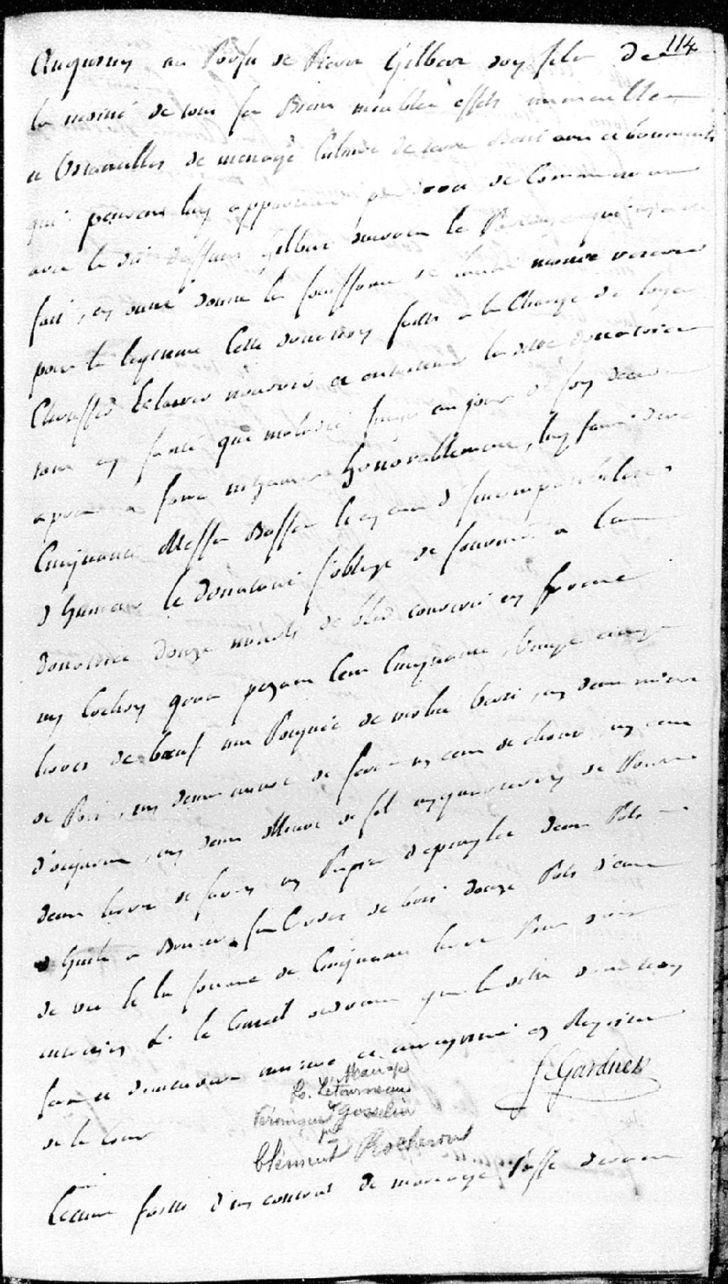 Lecture d'un contrat de mariage passé devant maître Crespin, le 6 avril 1763, entre Louis L'Étourneau (Létourneau), habitant de Sainte-Famille, et Véronique Gosselin, veuve de feu Clément Rocheron. Le Conseil ordonne que le présent contrat sera et demeurera insinué et registré au greffe de la Cour et Conseil militaire de Québec, 23 juillet 1763, Archives nationales à Québec, Fonds Conseil militaire de Québec, (03Q,TL9,P5407).