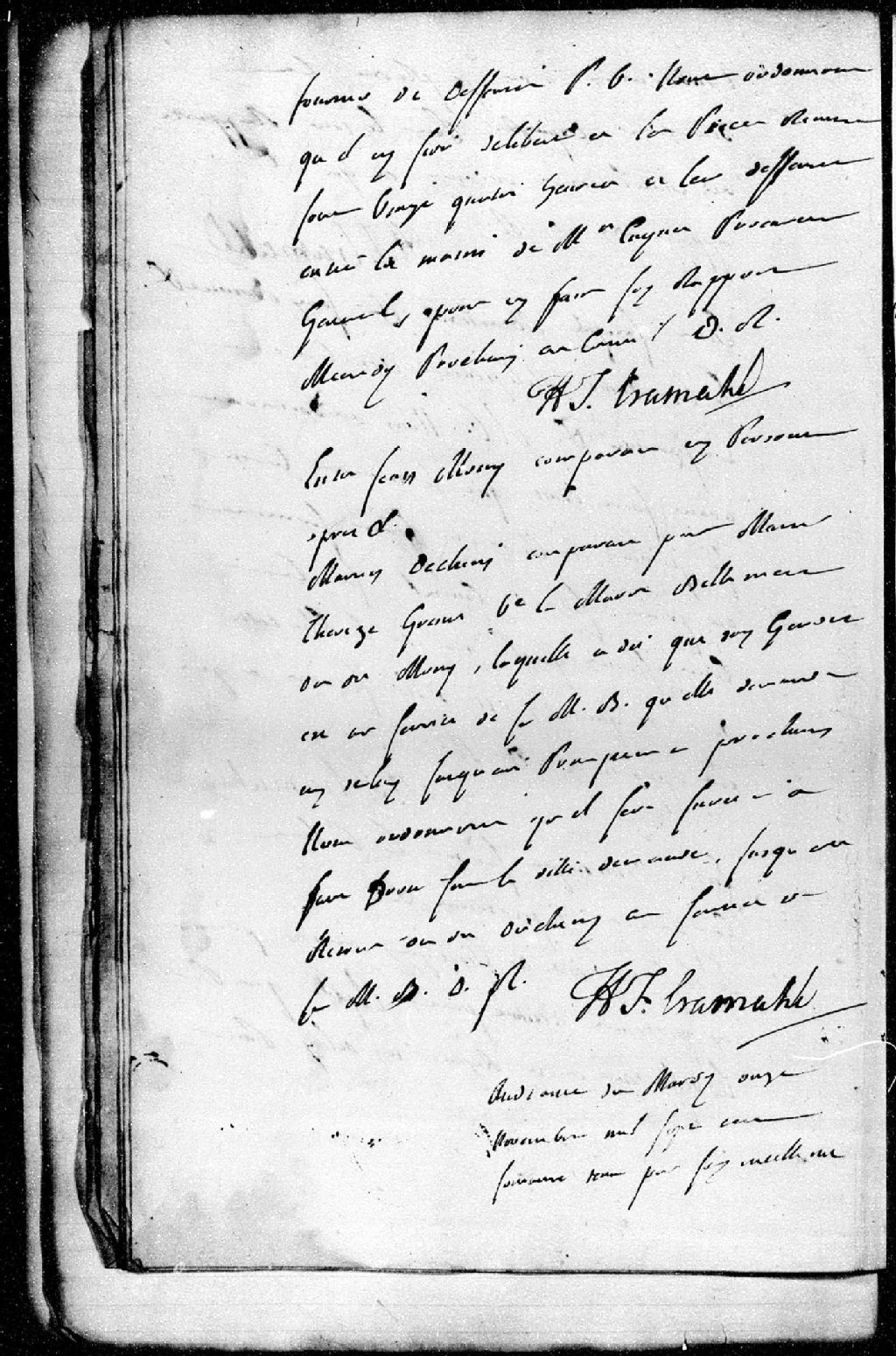 Jean Mony demandeur contre Martin Decheny, représenté par sa belle-mère Marie-Thérèse Grenet, qui demande un délai jusqu'au printemps afin que son gendre puisse comparaître en personne, s'étant absenté pour son travail au service de Sa Majesté britannique