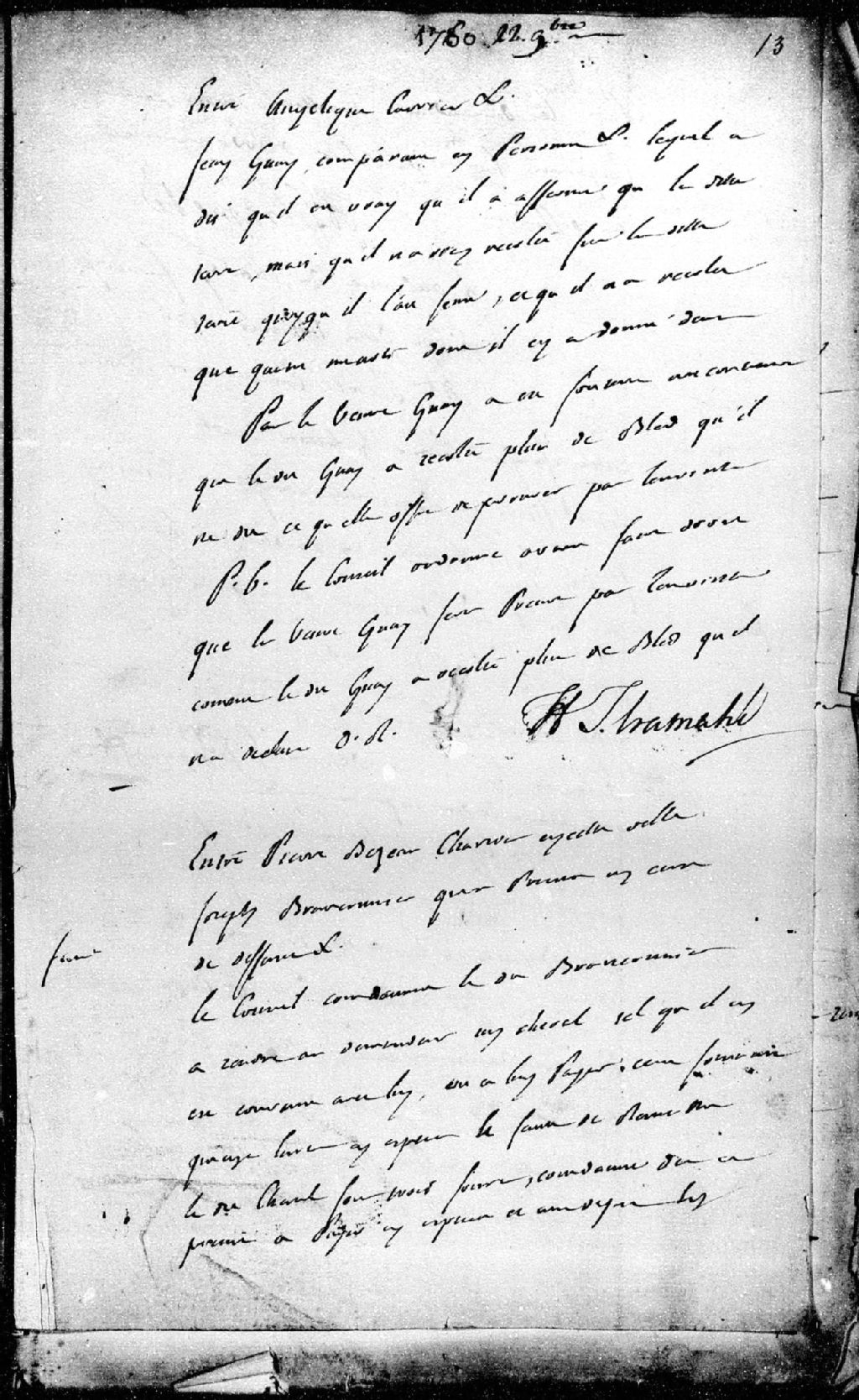 Pierre Bezeau (chartier) demandeur, contre Joseph Braconnier, défendeur. Le Conseil condamne ledit Braconnier à rendre au demandeur un cheval, tel qu'il avait été convenu avec lui, ou à lui payer 175 livres en espèces, 22 novembre 1760, Archives nationales à Québec, Fonds Conseil militaire de Québec, (03Q,TL9,P6031).