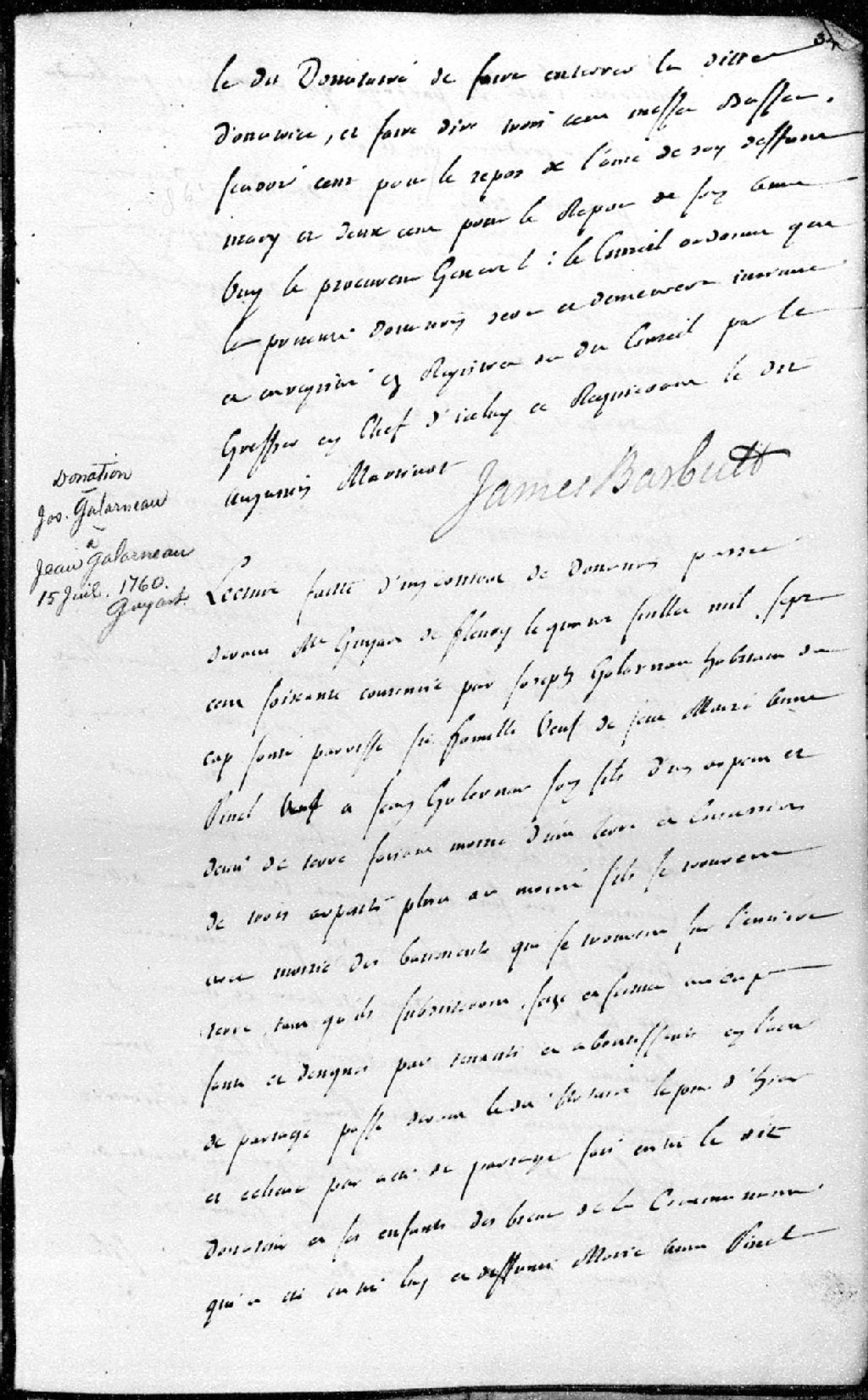 Lecture d'un contrat de donation passé devant maître Guyart De Fleury, notaire, consenti Joseph Galarneau, habitant du Cap-Santé, paroisse Sainte-Famille, veuf de Marie Anne Pinel, au profit de Jean Galarneau, son fils. Le Conseil ordonne que le présent contrat sera et demeurera insinué et registré au greffe de la Cour et Conseil militaire de Québec, 24 janvier 1761, Archives nationales à Québec, Fonds Conseil militaire de Québec, (03Q,TL9,P6084).