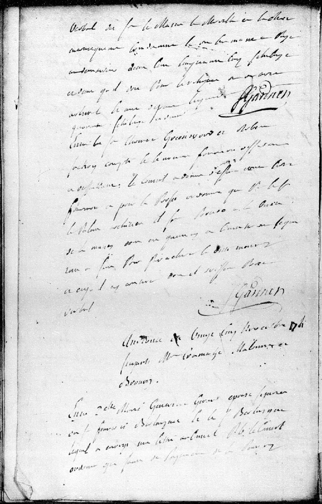 Entre Thomas Greenwood et Robert Jackon, demandeurs, et François Fourmois, défendeurs. Le Conseil a donné défaut contre ledit Fourmois et, pour le profit ordonne, que par le sieur Lapalme, architecte, il sera procédé à la visite de la maison dont il est question et constatera ce qui reste à faire pour parachever ladite maison et ce qu'il en coûtera. Le procès-verbal sera rapporté au Conseil pour être ordonné ce qu'il appartiendra