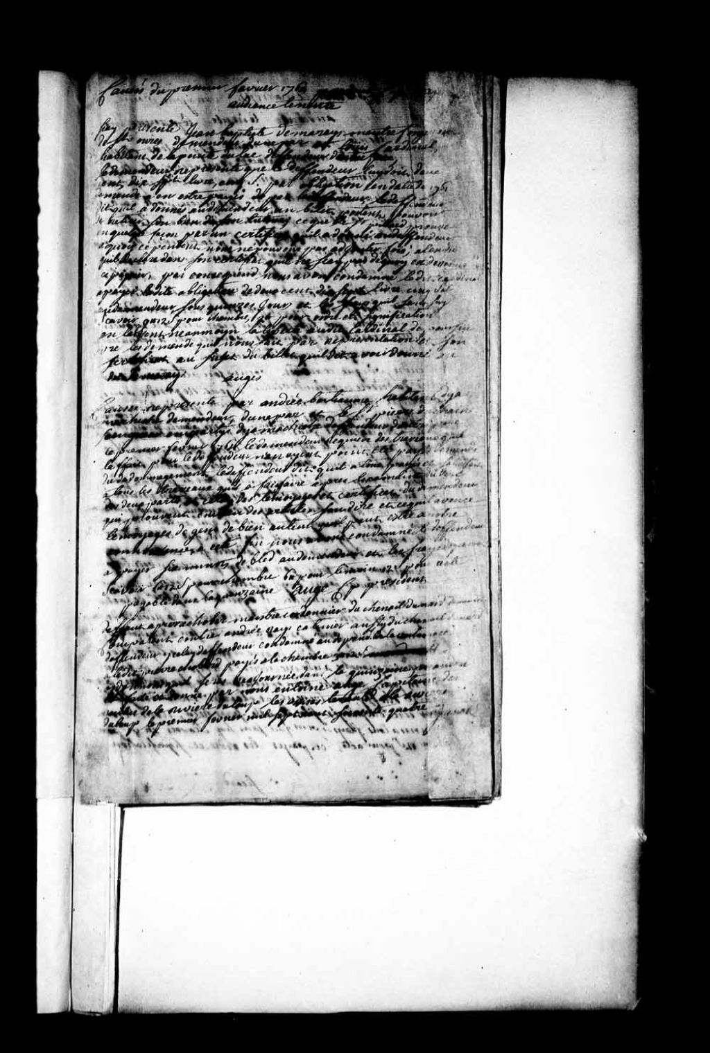 Défaut accordé à Pierre Chobard (Chober, Chaubert, Chabert), maître cordonnier du chenail du Nord, demandeur comparant, contre André Ray (Rey, Roy), cantinier, aussi du chenail du Nord, défendeur; condamnation du défendeur aux dépens de la contumace et aux frais de chambre du demandeur et réajournement (réassignation) du défendeur dans la quinzaine, 1er février 1764, Archives nationales à Québec, Fonds Cour de la Chambre de milice de Rivière-du-Loup (Louiseville), (03Q,TL542,P3).