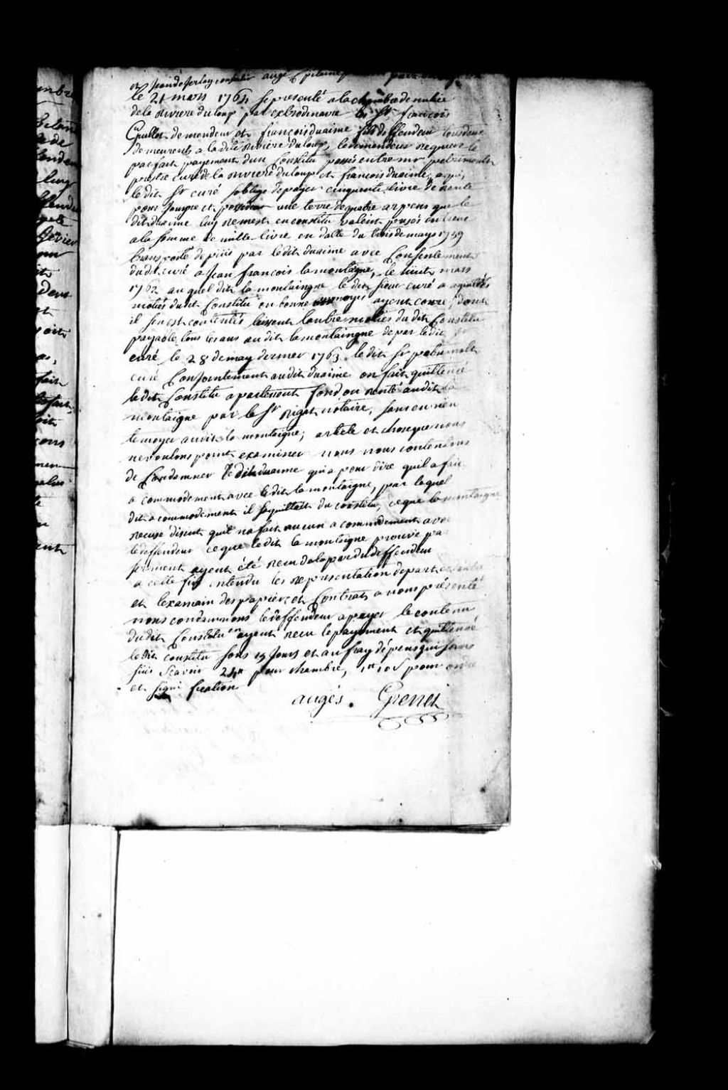 Cause entre François Guillot (Guillotte, Diotte), demeurant à la Rivière-du-Loup (Louiseville), demandeur, d'une part, et François Duaime (Duhaime) fils, demeurant à la Rivière-du-Loup (Louiseville), défendeur, d'autre part, laquelle cause étant relative au défaut de paiement d'un constitu (rente) passé entre le sieur Pétrimoulx, prêtre curé de la Rivière-du-Loup, et ledit Duhaime sur une terre depuis transportée à Jean-François Lamontaigne (Lamontagne); condamnation dudit défendeur à payer le contenu dudit constitu audit demandeur, ainsi qu'au paiement des frais et dépens, 21 mars 1764, Archives nationales à Québec, Fonds Cour de la Chambre de milice de Rivière-du-Loup (Louiseville), (03Q,TL542,P8).