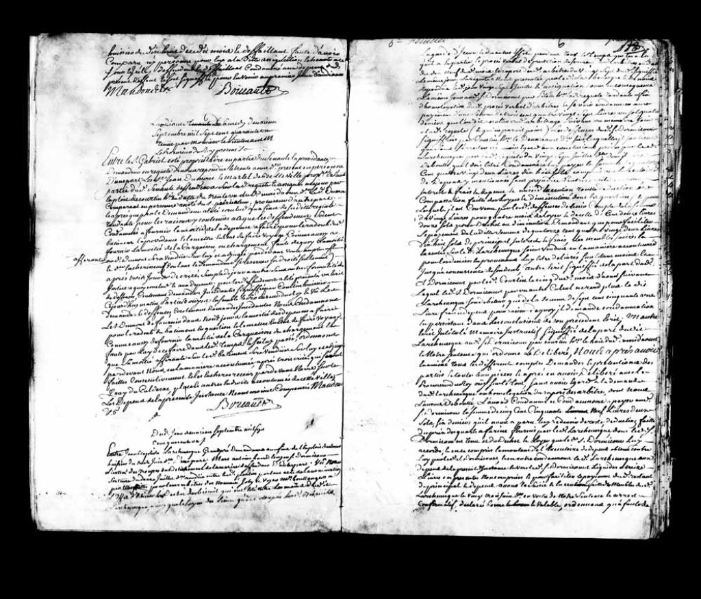 Cause entre le sieur Gabriel Coté, propriétaire en partie du senau (navire de commerce) La Providence, demandeur, contre les sieurs Jean Dumont et Martel de Belleville, propriétaires de l’autre partie du senau (navire de commerce), défendeurs., 2 septembre 1741, Archives nationales à Québec, Fonds Amirauté de Québec, (03Q,TP2,S11,SS1,P16).