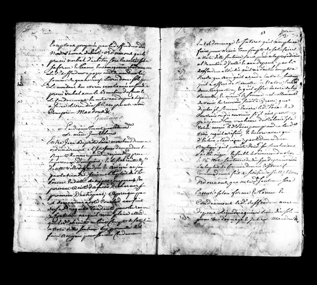 Cause entre Jean-Baptiste Locas, marchand demeurant ordinairement à l’île Jésus, demandeur, contre le sieur Chemiette, négociant de Québec, défendeur, assisté du sieur Decharnay, son procureur., 23 octobre 1753, Archives nationales à Québec, Fonds Amirauté de Québec, (03Q,TP2,S11,SS1,P199).