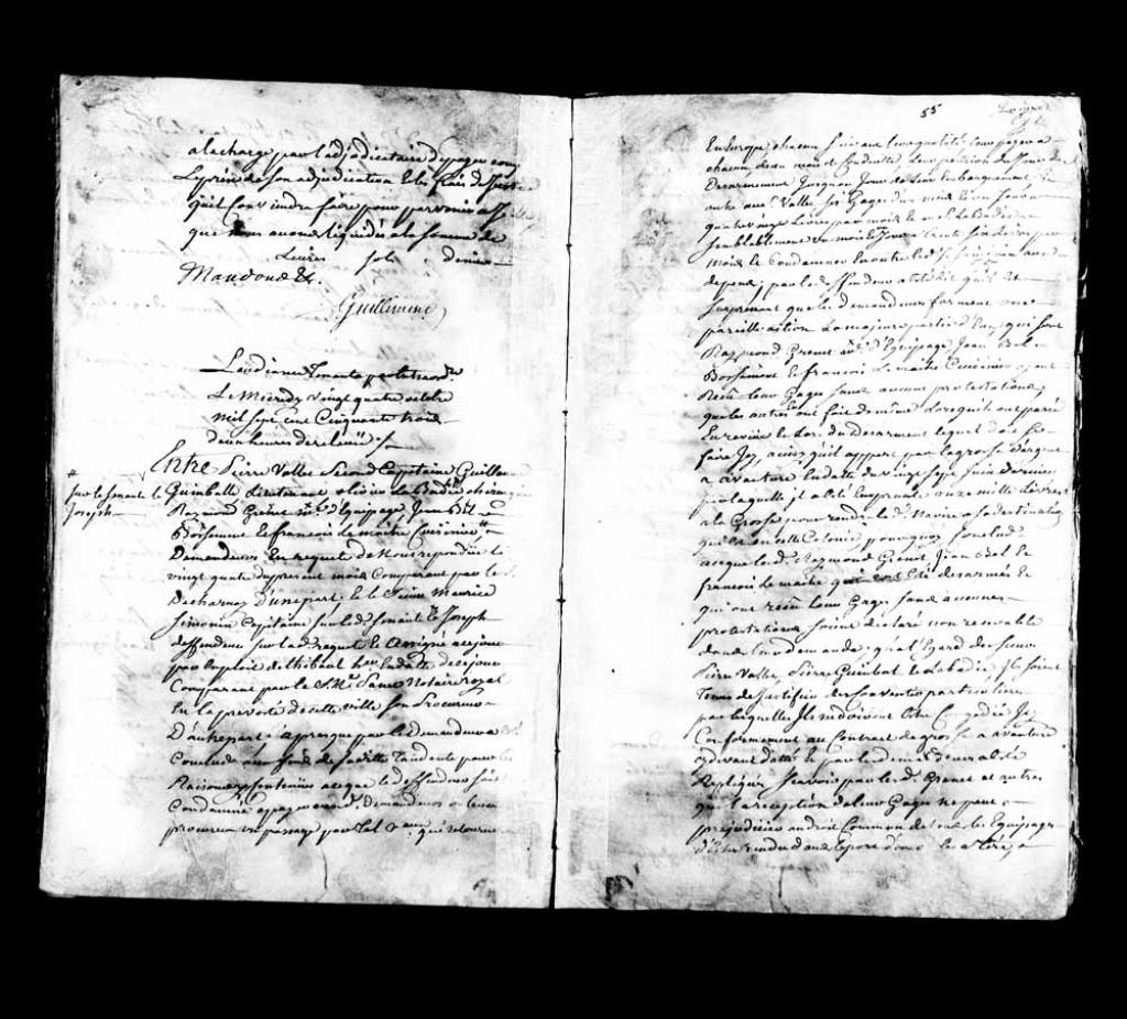 - Cause entre les sieurs Pierre Vallée, Guillaume Guinballe, Olivier LaBadie, Raymond Grenet, Jean-Baptiste Bonserment et François Lemaître, membres d’équipage sur le senau (navire de commerce) le Joseph comparant par le sieur Decharnay, contre le sieur Maurice Simonin, capitaine sur ledit senau, défendeur, comparant par maître Panet, son procureur.