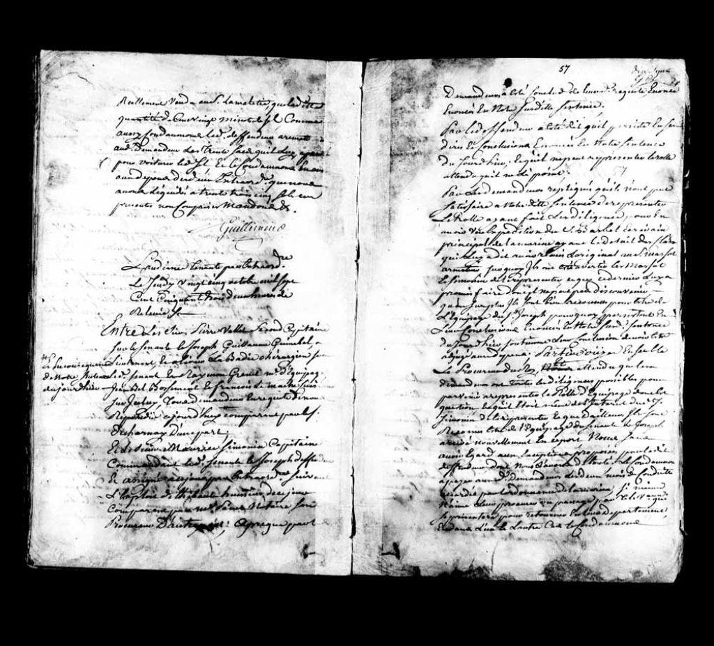 - Cause entre les sieurs Pierre Vallée, Guillaume Guinbal, Olivier LaBadie, Raymond Grenet, Jean-Baptiste Bonserment et François Lemaître, membres d’équipage sur le senau (navire de commerce) le Joseph, demandeurs, comparant par le sieur Decharnay, contre le sieur Maurice Simonin, capitaine et commandant sur ledit senau, défendeur, comparant par maître Panet, notaire, son procureur.