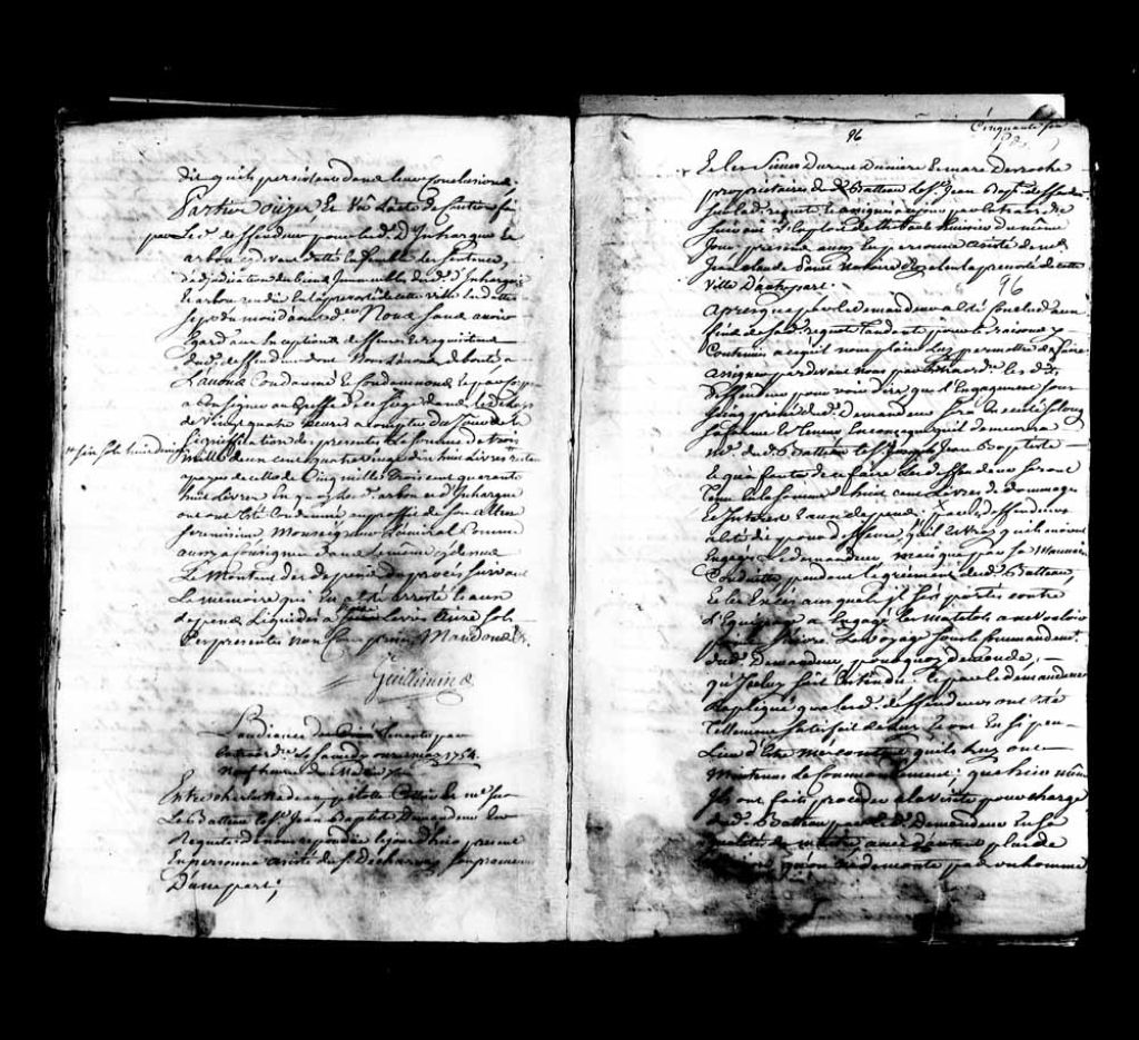 - Cause entre Charles Nadeau, pilote côtier et maître sur le bateau le Saint-Jean-Baptiste, demandeur, assisté du sieur Decharnay, son procureur, contre les sieurs Jean Durant, Louis Gunière et Marc Desroche, propriétaires dudit bateau, défendeurs, assistés de maître Jean-Claude Panet, notaire royal en la Prévôté de Québec.