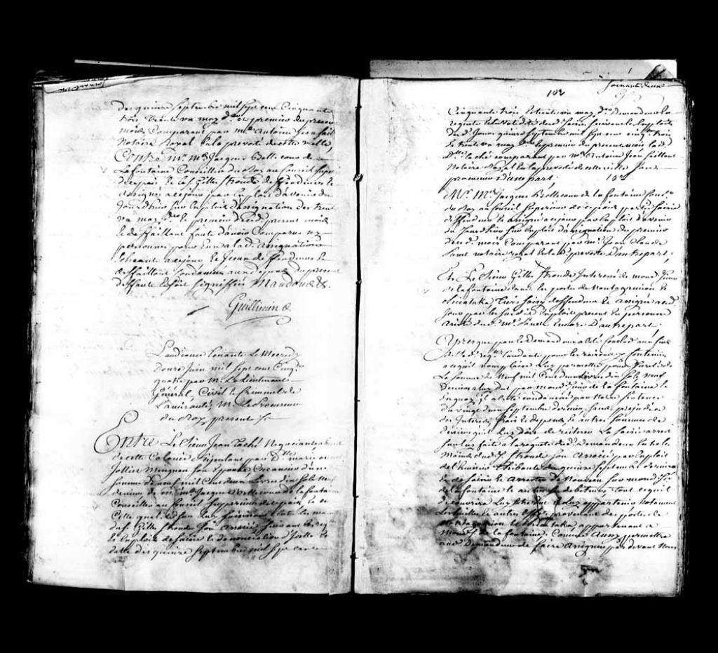 - Le titre complet de la pièce se lit comme suit : Cause entre le sieur Jean Taché, négociant de Québec, absent de cette colonie, stipulant par damoiselle Marie-Anne Jolliet Mingan (Joliet Maingan), son épouse, comparant par maître Jean-Antoine Saillant, notaire royal en la Prévôté de Québec, créancier d¿une somme de 9 102 livres 10 sols 9 deniers, contre Jacques Bellecours de la Fontaine (Belcourt de LaFontaine), conseiller du Roi au Conseil supérieur de la Nouvelle-France, et le sieur Gilles Stroud (Strouds), son associé et intéressé dans les postes de Montagamion et Chicataka, comparant par maître Jean-Claude Panet, notaire royal en la Prévôté de Québec.Le demandeur allègue que les défendeurs ont été condamnés par la sentence du tribunal du 22 septembre 1753 et demande que soient déclarées bonnes et valables la saisie et saisie-arrêt effectuées sur les défendeurs, et que les défendeurs soient assignés dans les délais de l¿Ordonnance [de la Marine]. Le défendeur le sieur de la Fontaine accepte que la saisie pratiquée sur lui soit valide et que les sommes soient remises au demandeur. Le sieur Stroud plaide qu¿il doit faire le compte des prises et de l¿équipement sortant des postes de pêche, et que ce compte ne sera complété qu¿au mois de septembre. Le demandeur réplique que cela n¿empêche pas le défendeur de faire une déclaration affirmative de valeurs des huiles et peaux actuellement saisies à Québec et provenant des postes, et pour lesquelles le demandeur requiert l¿autorisation de vendre. Le sieur Stroud déclare qu¿il a vendu 200 barriques d¿huile au sieur Amyot à 75 livres la barrique et qu¿il a 1,000 peaux de loup-marin à vendre. Le demandeur réclame une ordonnance à l¿effet que le défendeur soit obligé de retenir le produit de ces ventes. Et comparaît François Thibault, huissier, stipulant pour les sieurs Havy et Lefebvre, négociants à Québec, agissant pour leur compte, car le sieur de la Fontaine leur doit 321 livres, 11 sols 8 deniers, et pour le sieur Garrison, négociant à Bordeaux, créancier du sieur de la Fontaine pour la somme de 5 458 livres 4 sols. Le sieur de la Fontaine avait été condamné à payer ces sommes par la Prévôté de Québec en août et octobre 1753, et les créanciers demandent permission d¿intervenir. Le tribunal donne acte aux déclarations des défendeurs et à la requête d¿intervenir des sieurs Havy et Lefebvre, et déclare valide la saisie-arrêt du sieur de la Fontaine faite entre les mains du sieur Stroud. Celui-ci est ordonné de retenir du produit de la vente toute somme appartenant au sieur de la Fontaine. Le tribunal en conséquence déclare bonnes et valables les saisies des revenus de la vente des 200 barriques d¿huile et des 1000 peaux de loups-marins (phoques) provenant desdits postes par le défendeur. Le sieur Stroud est de plus condamné à rendre des comptes dans le mois de septembre et le sieur de la Fontaine est condamné à s¿acquitter des dépens