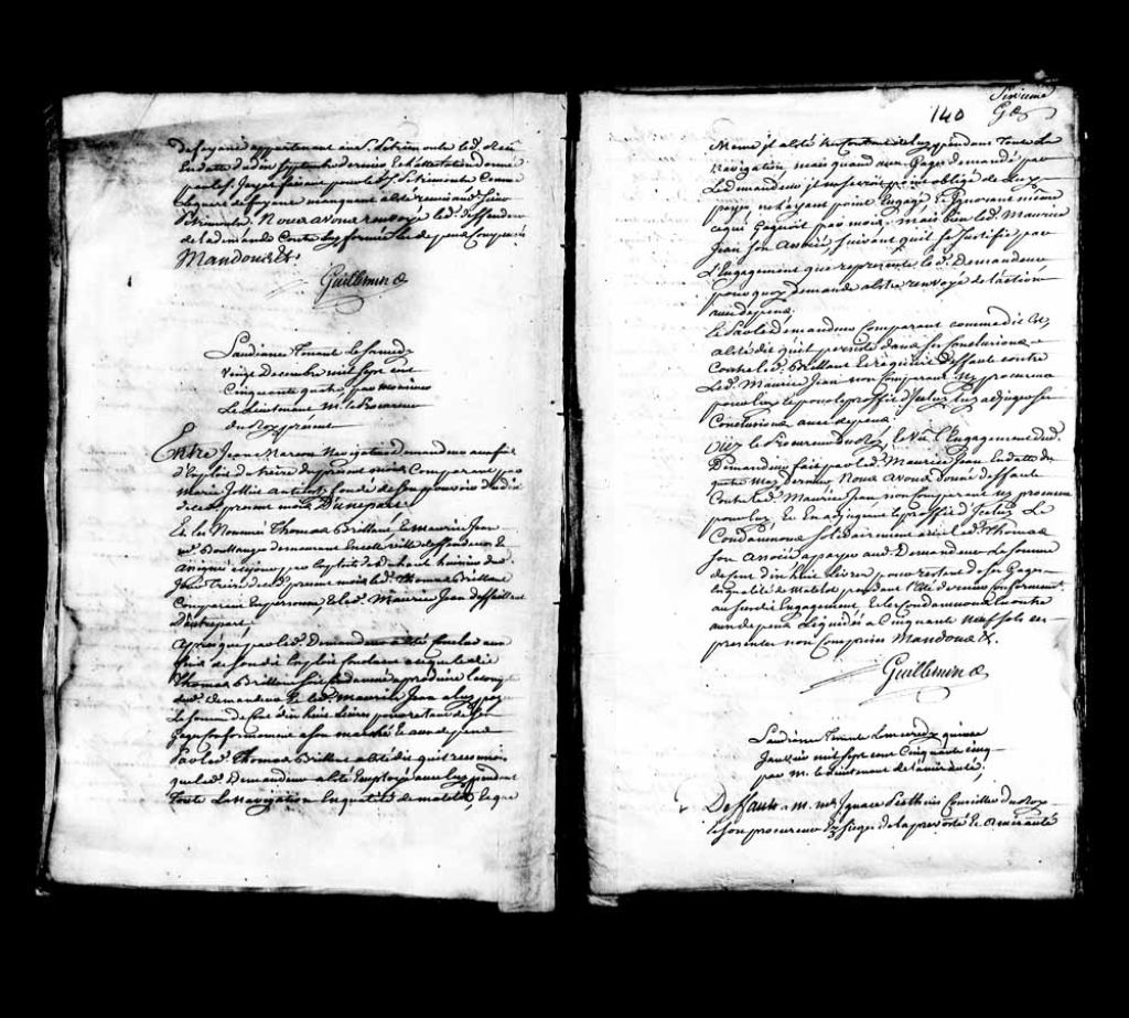 - Défaut à maître Ignace Perthuis, conseiller du Roi et son procureur, et diligence de maître Joseph Nouchet, et du sieur Joseph LePellé Devoisy receveur des droits de Son Altesse Sérénissime monseigneur l’Amiral, demandeurs, contre les nommés Vincent Riou et Nicolas Riou, résidant à l’anse au Coq et à la rivière des Trois-Pistoles, tiers saisis, défendeurs.