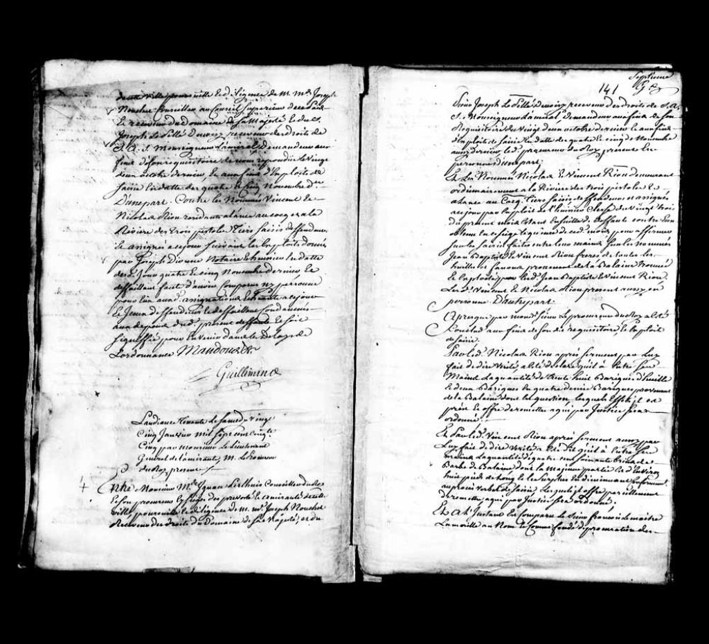 - Le titre complet de la pièce se lit comme suit : Cause entre maître Ignace Perthuis (Perthuy), conseiller du Roi et son procureur au siège de la Prévôté et Amirauté de Québec, et diligence de maître Joseph Nouchet, conseiller au Conseil supérieur de la Nouvelle-France et receveur du Domaine de Sa Majesté, et du sieur Joseph LePellé Devoisy (Le Pellé, Lepelé, de Voisy), receveur des droits de Son Altesse Sérénissime monseigneur l¿Amiral, demandeurs, contre les nommés Vincent Riou et Nicolas Riou (Rioux), résidant à l¿anse au Coq et à la rivière des Trois-Pistoles, tiers saisis.Les demandeurs, réclamant le bénéfice des produits venant d¿une baleine trouvée par les défendeurs, ont pratiqué une saisie entre les mains de Jean-Baptiste Riou et Vincent Riou, frères, de toutes les huiles et fanons provenant de la baleine trouvée et exploitée par lesdits Jean-Baptiste Riou et Vincent Riou. Nicolas Riou déclare posséder 38 barriques d¿huile ainsi que deux barriques et quatre demi-barriques d¿huile de la baleine qu¿il est prêt à remettre à qui de droit. Vincent Riou déclare posséder 460 brins de barbe de baleine, la plupart huit pieds de long et est prêt à les remettre à qui de droit. Et comparaît François Lemaître Lamorille, comme fondé de pouvoir de Jean-Baptiste et Vincent Riou, demandant d¿intervenir afin d¿obtenir mainlevée de la saisie pratiquée sur Nicolas Riou. Le procureur du Roi répond en demandant le sursis à l¿intervention en attendant l¿arrivée à Québec des biens saisis, citant une lettre en termes peu mesurés écrite par les défendeurs. Nicolas Riou réplique qu¿il n¿a pas pu aviser Jean-Baptiste et Vincent vu son éloignement, et prie que la lettre ne soit pas interprétée comme une contestation de l¿autorité de la justice. Le tribunal donne acte aux déclarations faites par lesdits Nicolas Riou et Vincent Riou et acte d¿intervention faite par Lamorille auxdits noms. Lesdites huiles et fanons seront transportés en cette ville, la saisie toujours tenante. Entendu que ledit Nicolas Riou est contrevenu aux ordres de la justice, il est condamné à 50 livres d¿amende et défense lui est faite de récidiver