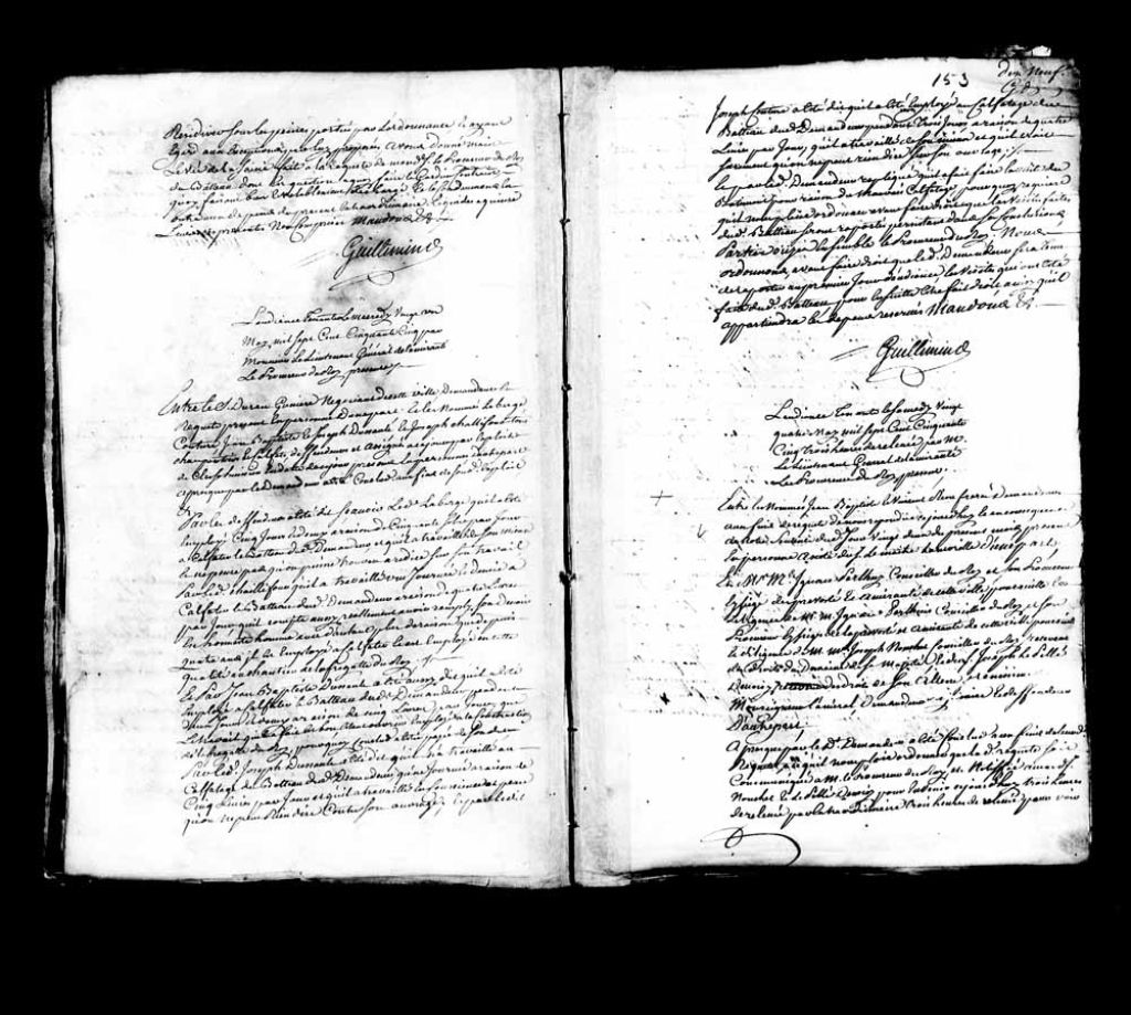 - Le titre complet de la pièce se lit comme suit : Cause entre les nommés Jean-Baptiste Riou et Vincent Riou (Rioux), frères, demandeurs, assistés de maître Lamorille, contre maître Ignace Perthuis, conseiller du Roi et son procureur au siège de la Prévôté et Amirauté de Québec, et la diligence de maître Joseph Nouchet, conseiller du Roi, receveur des droits du Domaine de sa Majesté, et du sieur Joseph LePellé Devoisy (Lepelé, Le pellé, de Voisy), receveur des droits de son Altesse monsieur l¿Amiral, demandeur originaire et défendeur. Suite à l¿ordonnance du 25 janvier 1755 et celle du 22 mai 1755 [Dispositifs, page 79], les fanons et l¿huile de baleine sous saisie étant à Québec, les demandeurs veulent obtenir la main levée. Les défendeurs admettent avoir pris connaissance d¿une preuve suffisante à l¿effet que la baleine a été prise à flot et consentent à donner main levée de la saisie faite entre les mains de Nicolas et Vincent Riou, à la condition que les demandeurs paient les frais de procédure et l¿amende prononcée contre Nicolas Riou. Le tribunal, vu les déclarations faites au greffe par Laurent L¿Emelin et par Vincent Riou, père des demandeurs, à l¿effet que la baleine a été réellement trouvée à flot, donne main levée de la saisie faite entre les mains desdits Nicolas Riou et Vincent Riou, délivrance leur sera faite desdites huiles et fanons comme choses leurs appartenant, bien et valablement déchargés, à la condition de payer les frais de la procédure ainsi que l¿amende de 50 livres prononcée contre Nicolas Riou, tiers saisie, avec le droit de demander remboursement de celui-ci.