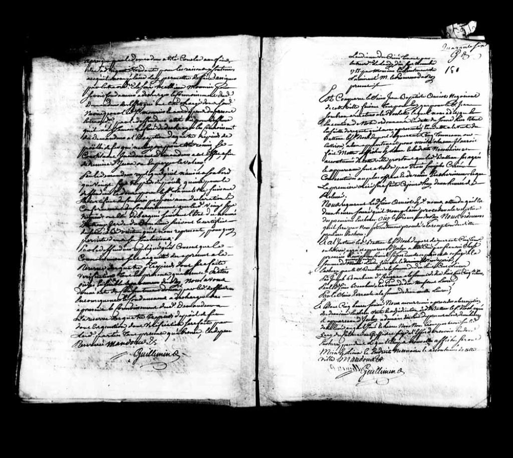 Vente aux enchères par le sieur Jean-Baptiste Amyot, négociant de Québec, faisant tant pour lui que pour le sieur Jean Sombrun, armateur de La Rochelle, pour la vente du bateau le Saint-Roch, appartenant pour moitié à chacun., 17 novembre 1755, Archives nationales à Québec, Fonds Amirauté de Québec, (03Q,TP2,S11,SS1,P350).