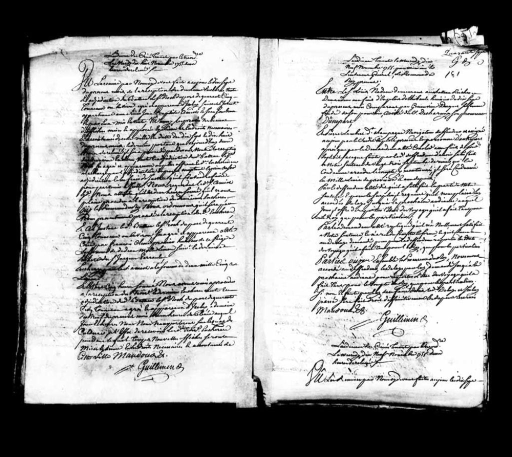 Vente aux enchères par le sieur Jean-Baptiste Amyot, négociant de Québec, faisant tant pour lui que pour le sieur Jean Sombrun, armateur de La Rochelle, pour la vente du bateau le Saint-Roch appartenant pour moitié à chacun., 18 novembre 1755, Archives nationales à Québec, Fonds Amirauté de Québec, (03Q,TP2,S11,SS1,P351).