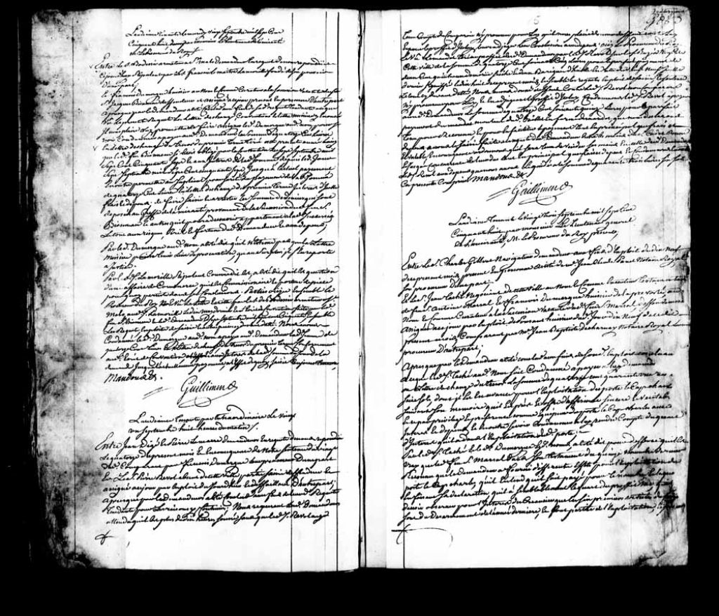 Cause entre Jean Digé et Pierre Lamarre, demandeurs, comparant par François Dumergue, leur procureur, contre le sieur Pierre Révol, absent de cette ville, partie saisie, défendeur et défaillant faute d’être comparu. Le défendeur a émis un billet de 1 465 livres en faveur du demandeur. Le tribunal condamne ledit défendeur à payer audit demandeur la somme de 1 465 livres pour le paiement du billet dont il est question. La saisie faite à la requête dudit demandeur est déclarée bonne et valable. Ledit Révol est aussi condamné aux dépens liquidés à 43 livres 6 sols., 21 septembre 1758, Archives nationales à Québec, Fonds Amirauté de Québec, (03Q,TP2,S11,SS1,P415).