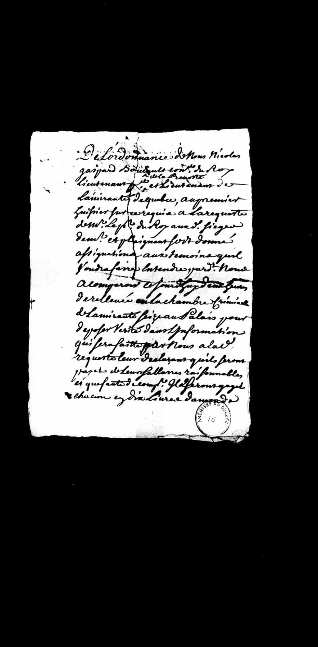 Ordonnance de Nicolas-Gaspard Boucault, conseiller du Roi, lieutenant de la Prévôté et de l'Amirauté de Québec, afin que le procureur du Roi voit sa requête exécutée, requête consistant à faire assigner plusieurs témoins pour compléter son information
