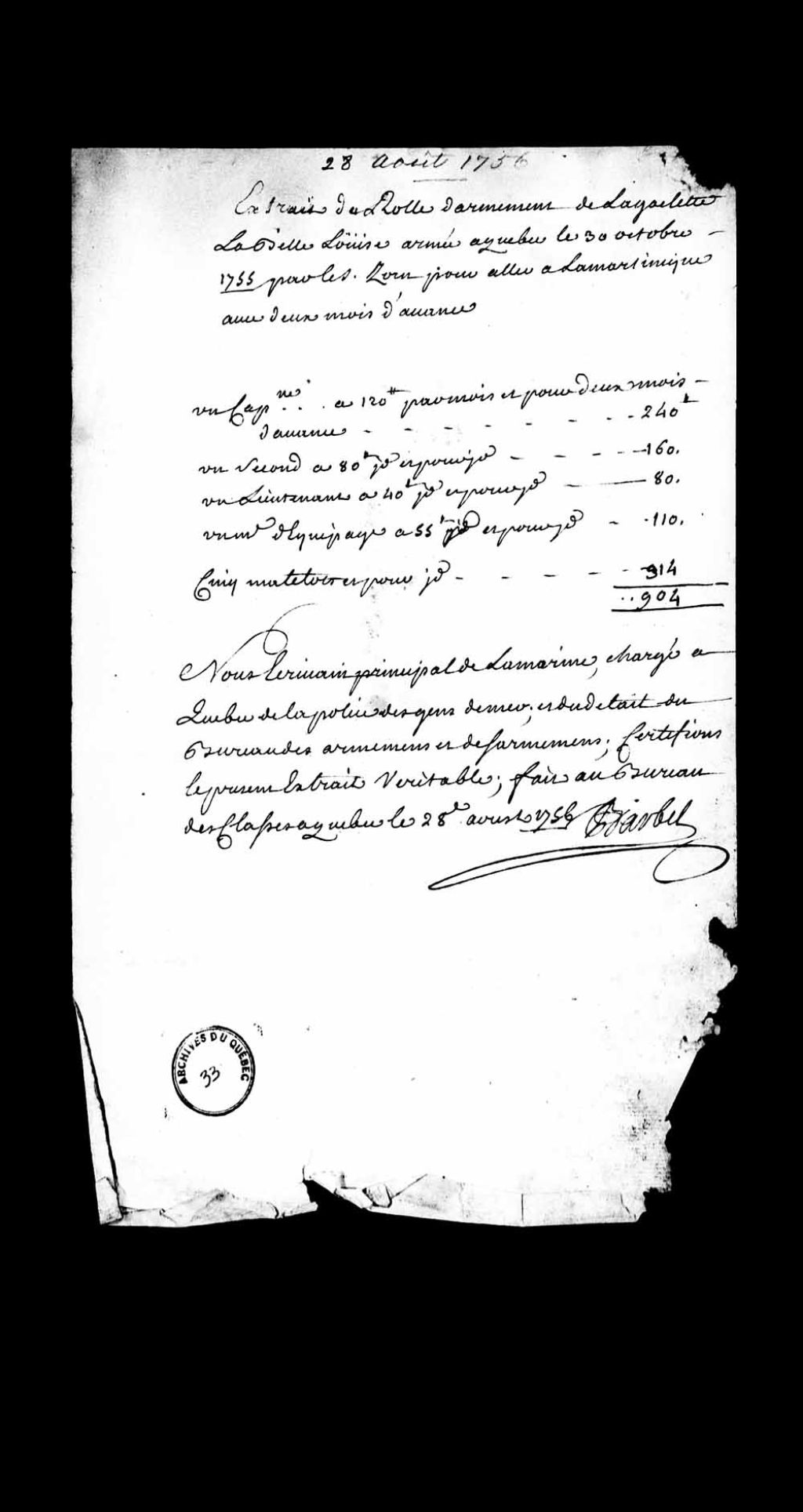 Extrait du rôle d'armement de la goélette «la Belle Louise» armée à Québec le 30 octobre 1755 et qui part pour la Martinique avec son capitaine et ses marins, lesquels sont nommés ainsi que leur salaire, 28 août 1756, Archives nationales à Québec, Fonds Amirauté de Québec, (03Q,TP2,S11,SS2,P37).
