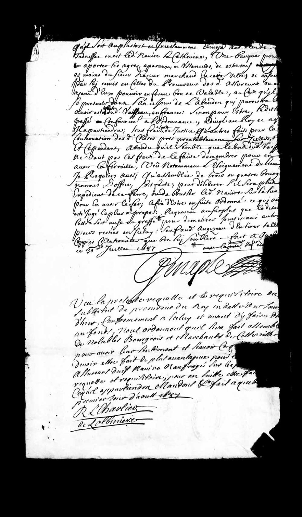 Acquiescement de René-Louis Chartier de Lotbinière à la requête et au réquisitoire présentés le 30 juillet 1687 respectivement par Mathieu Augizeau, maître du navire nommé «la Catherine», naufragé à Tadoussac à l'automne 1686, et par maître François Genaple, substitut du procureur du Roi, et déclaration ordonnant qu'une assemblée des notables, bourgeois et marchands de Québec soit convoquée pour savoir ce qu'ils estiment être le plus avantageux pour les assureurs dudit navire échoué