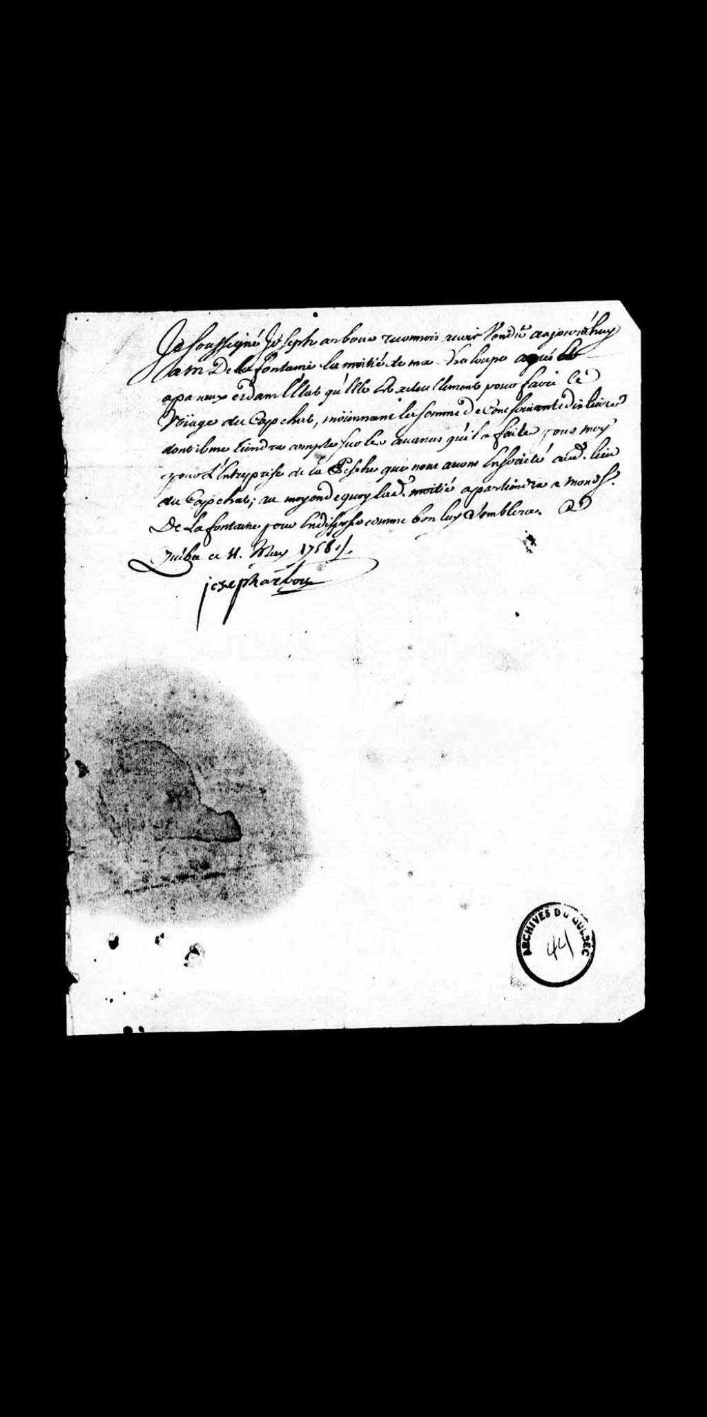 - Billet provisoire de Joseph Arbour (Harbour) à maître Jacques Bellecour de la Fontaine (Belcourt de LaFontaine), cause entre maître Jacques Belcour de Lafontaine, conseiller au Conseil supérieur de Québec, comparant par maître Jean-Baptiste Decharnay, notaire royal en la Prévôté de Québec, demandeur, contre Joseph Arbour, habitant demeurant à l'îlet Saint-Jean, défendeur, concernant le partage d'une pêche, défaut audit défendeur faute d'être comparu ni personne pour lui, ledit défaillant est condamné à rendre compte du produit de sa pêche en plus des dépens liquidés à 9 livres 10 sols