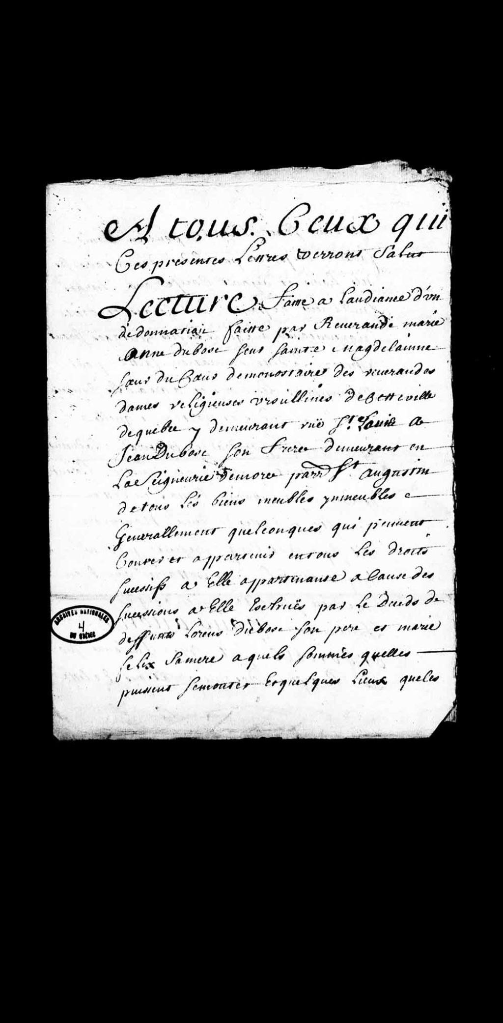 Donation par la Révérende Mère Marie-Anne Dubost (Duboc) (soeur Sainte-Madeleine, Ursuline de Québec), demeurant rue Saint-Louis en la Haute-Ville de Québec, à son frère Jean Dubost (Duboc), demeurant en la seigneurie de Maur (Desmaures), paroisse Saint-Augustin, de tous ses biens, meubles et immeubles provenant des successions de Laurent Dubost et Marie-Félix (Ouentouen), leur père et mère, à condition de payer les droits seigneuriaux, contrat passé devant Florent de La Cetière, notaire, le 2 novembre 1705 et présenté par Jacques Barbel, notaire, pour insinuation à la Prévôté de Québec